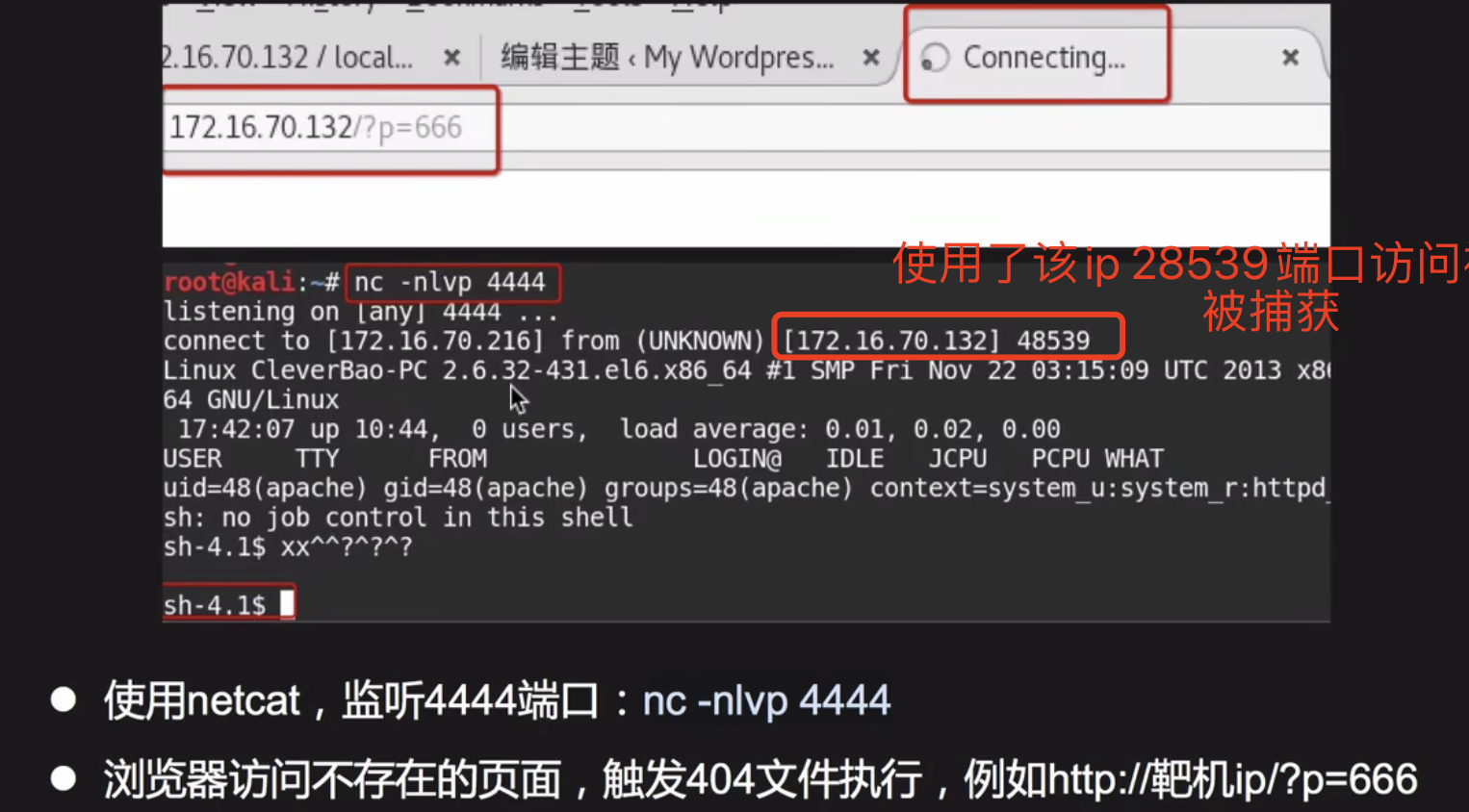 使用netcat,类似于中国菜刀,监听4444端口:nc -nlvp 4444
