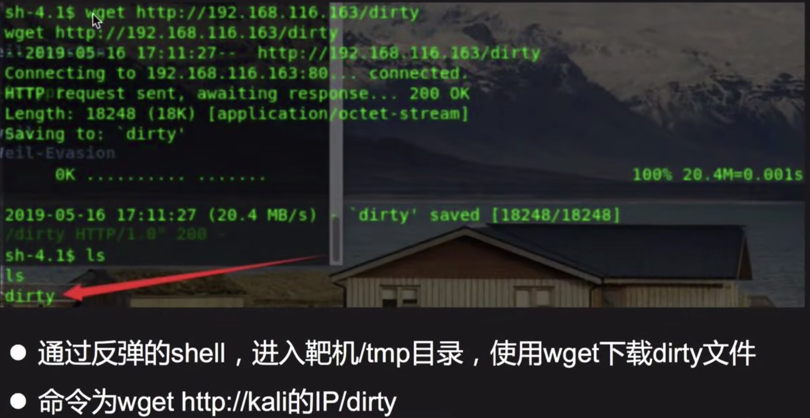 靶场那边则需要通过反弹的shell,进入靶机/tmp目录,使用wget下载dirty文件