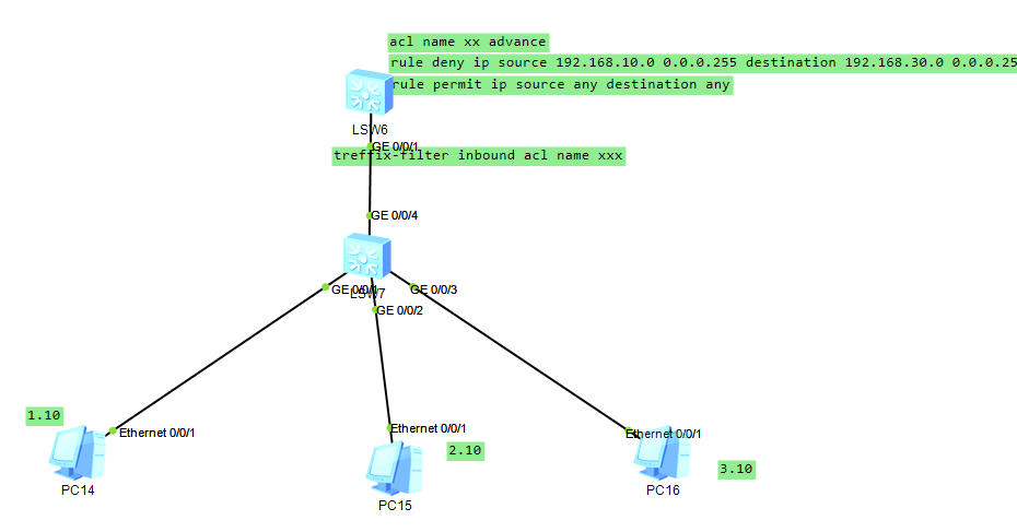 (4)在三层的接口:treffix-filter inbound acl name xxx 使用刚才配置的xx规则
