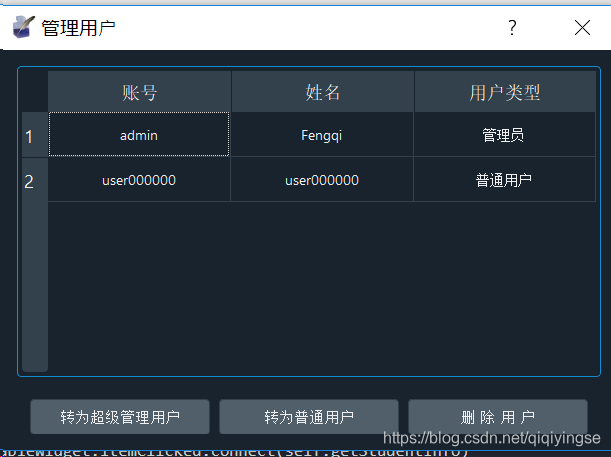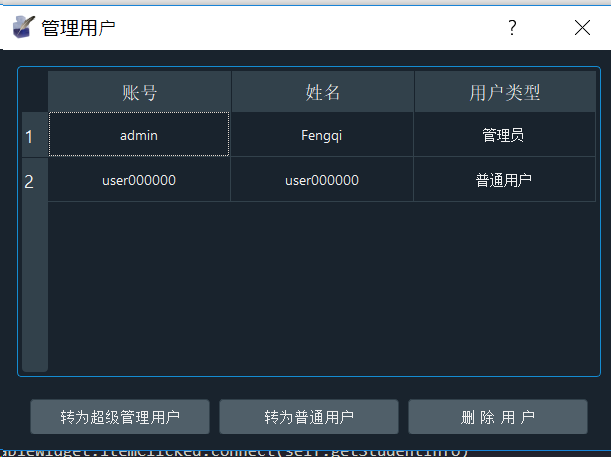self.tableWidget.setHorizontalHeaderLabels(['账号', '姓名','用户类型'])