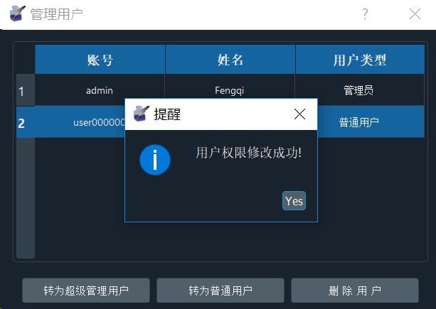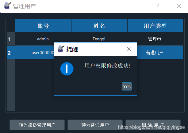 QMessageBox.information(self,"提醒","用户权限已经是普通用户,无需修改!",QMessageBox.Yes,QMessageBox.Yes)