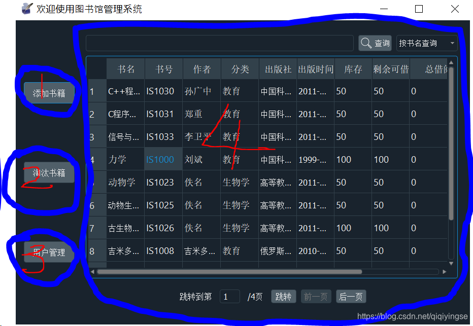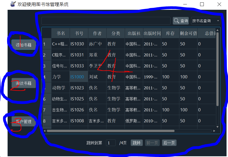 整个界面分为4个部分,左侧三个按钮,分别对应三个功能,中间是一个table,是书库查询功能