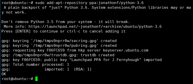 输入命令sudo add-apt-repository ppa:jonathonf/python-3.6