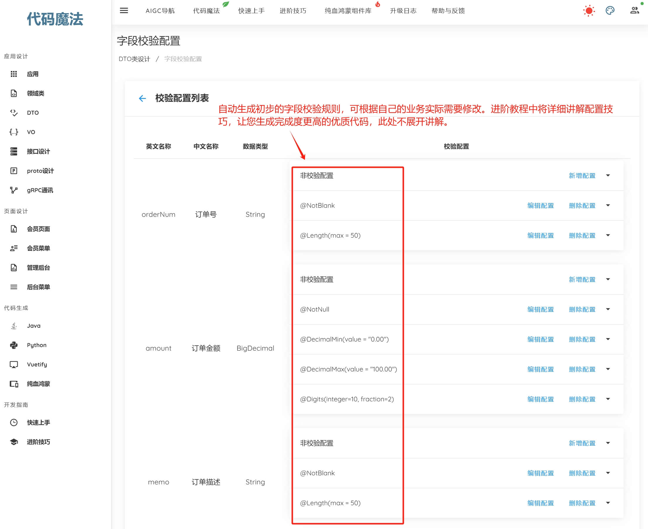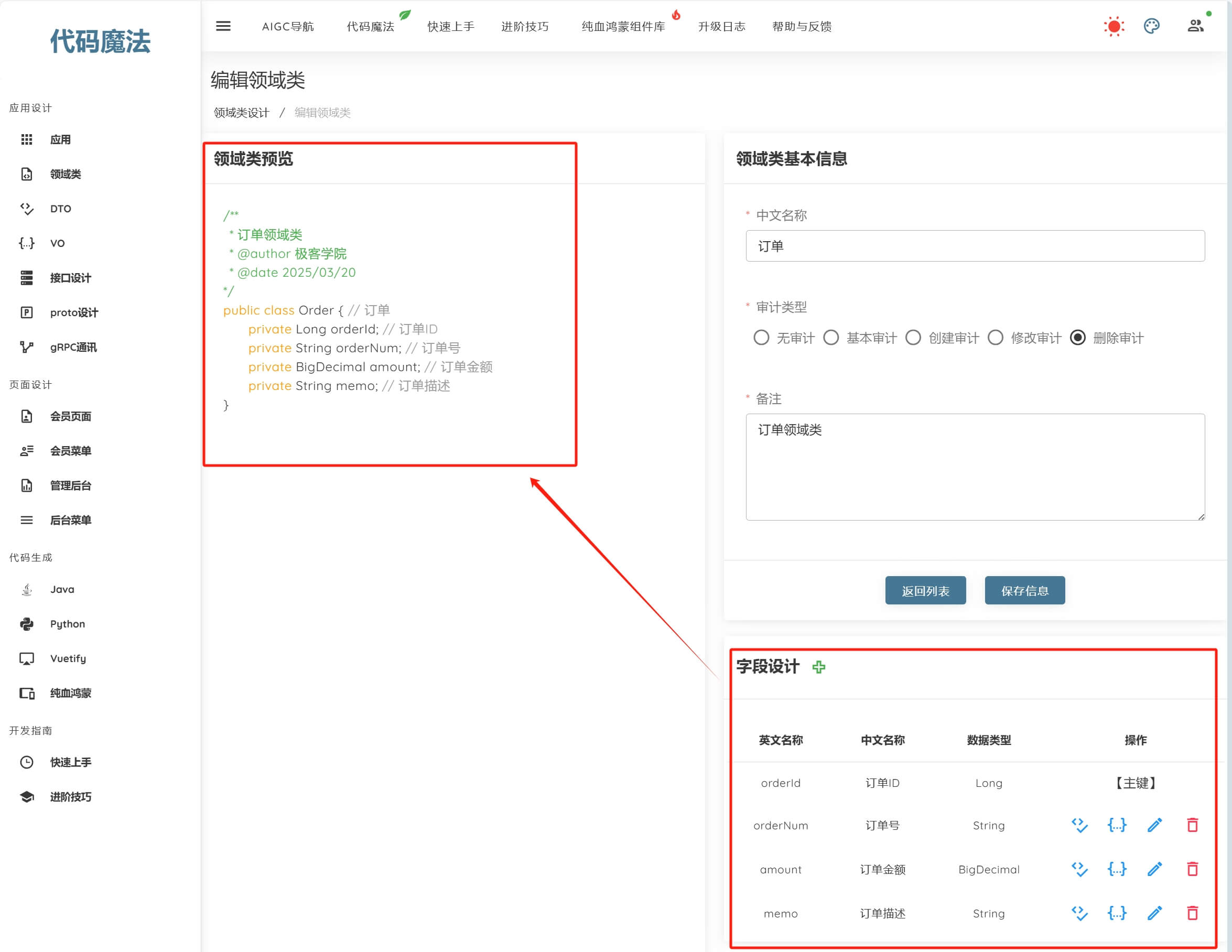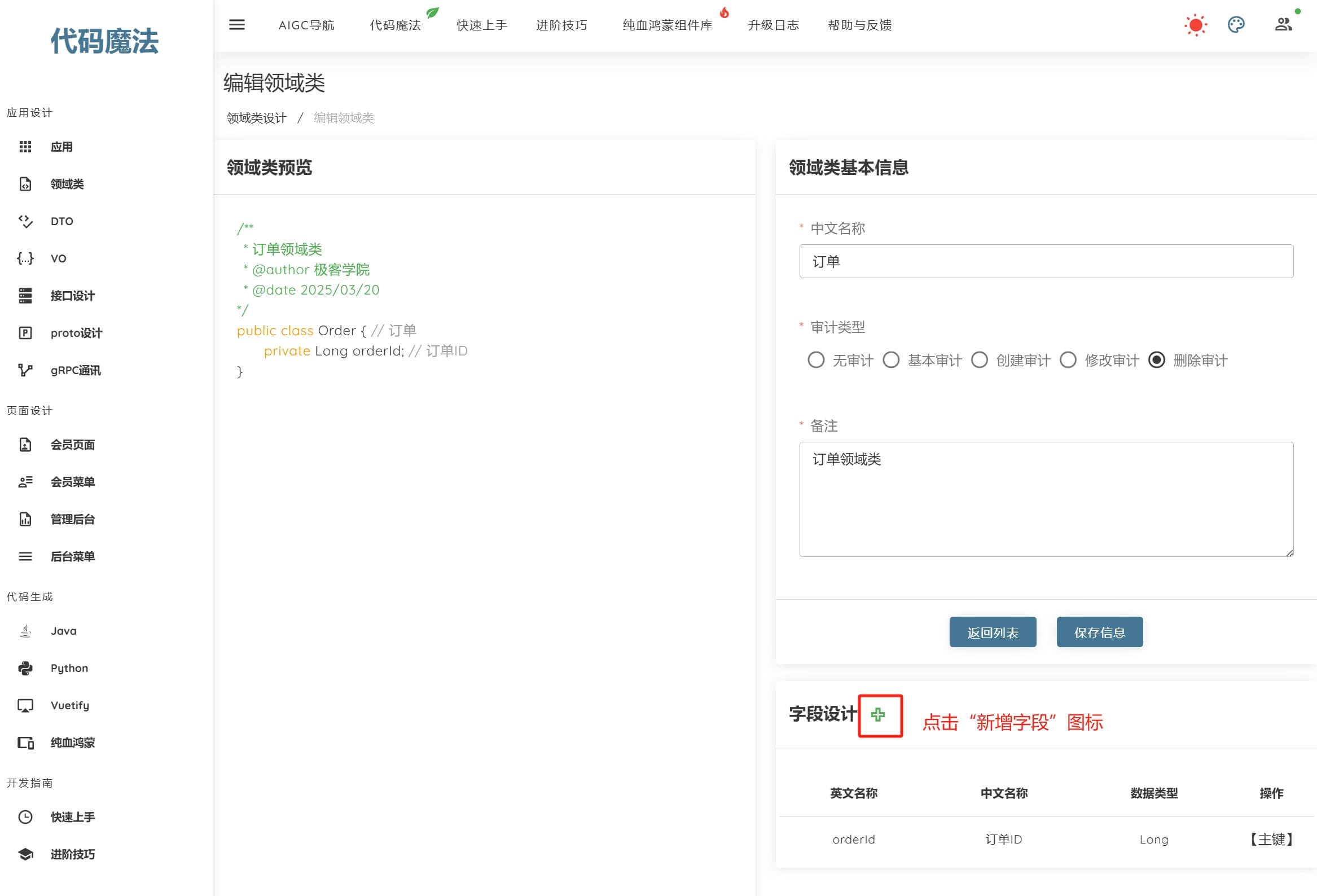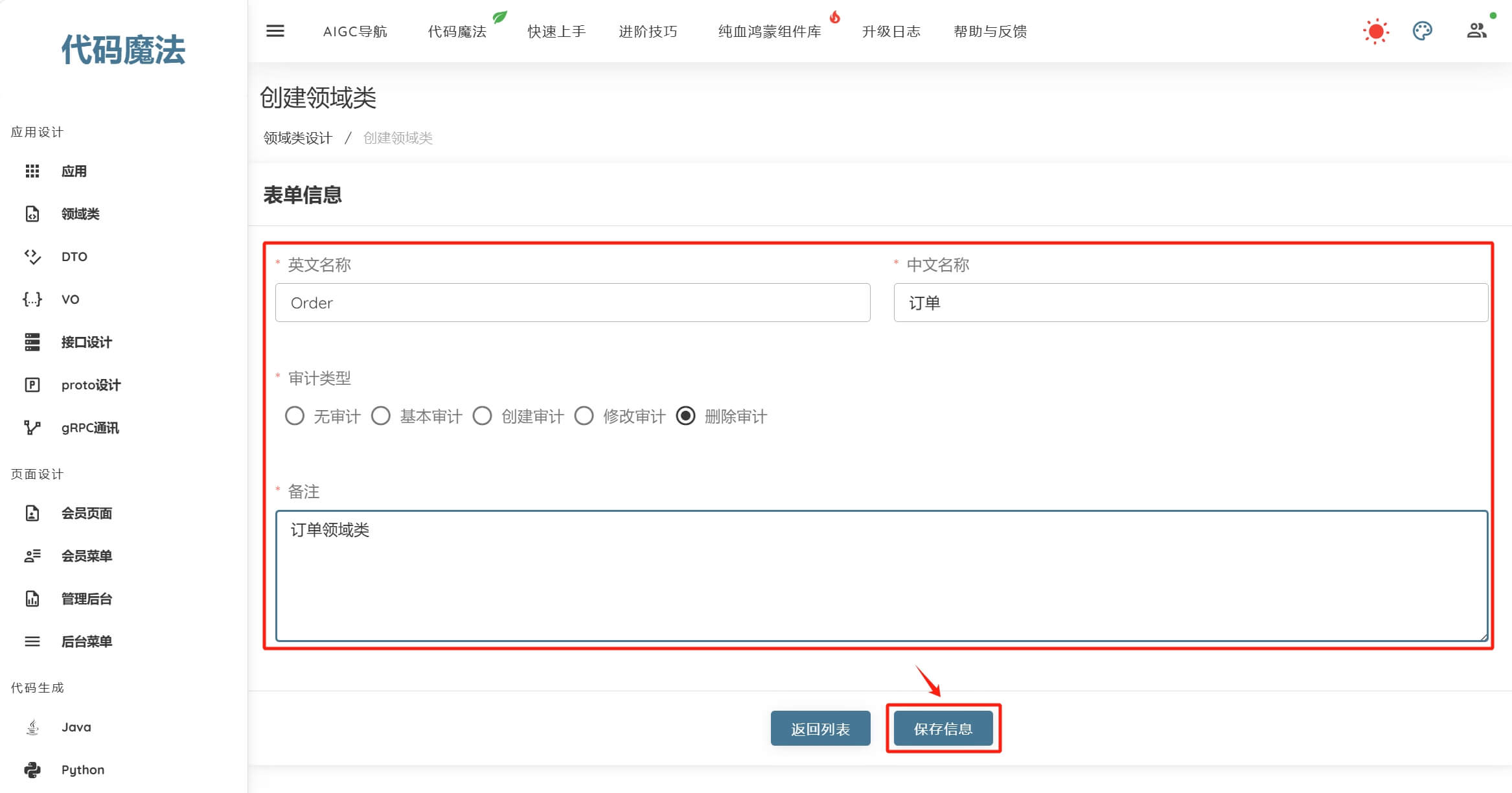 其中,审计类型的作用:无审计(不会在你设计的领域类字段之外增加审计字段);基本审计(在你设计的字段之外自动增加一个创建时间的字段);创建审计(在基本审计基础上再增加创建者ID和创建者昵称的字段);修改审计(在创建审计基础上再增加最后修改时间、修改者ID和修改者昵称的字段);删除审计(在修改审计基础上再增加是否删除标记、删除时间、删除者ID和删除者昵称字段):