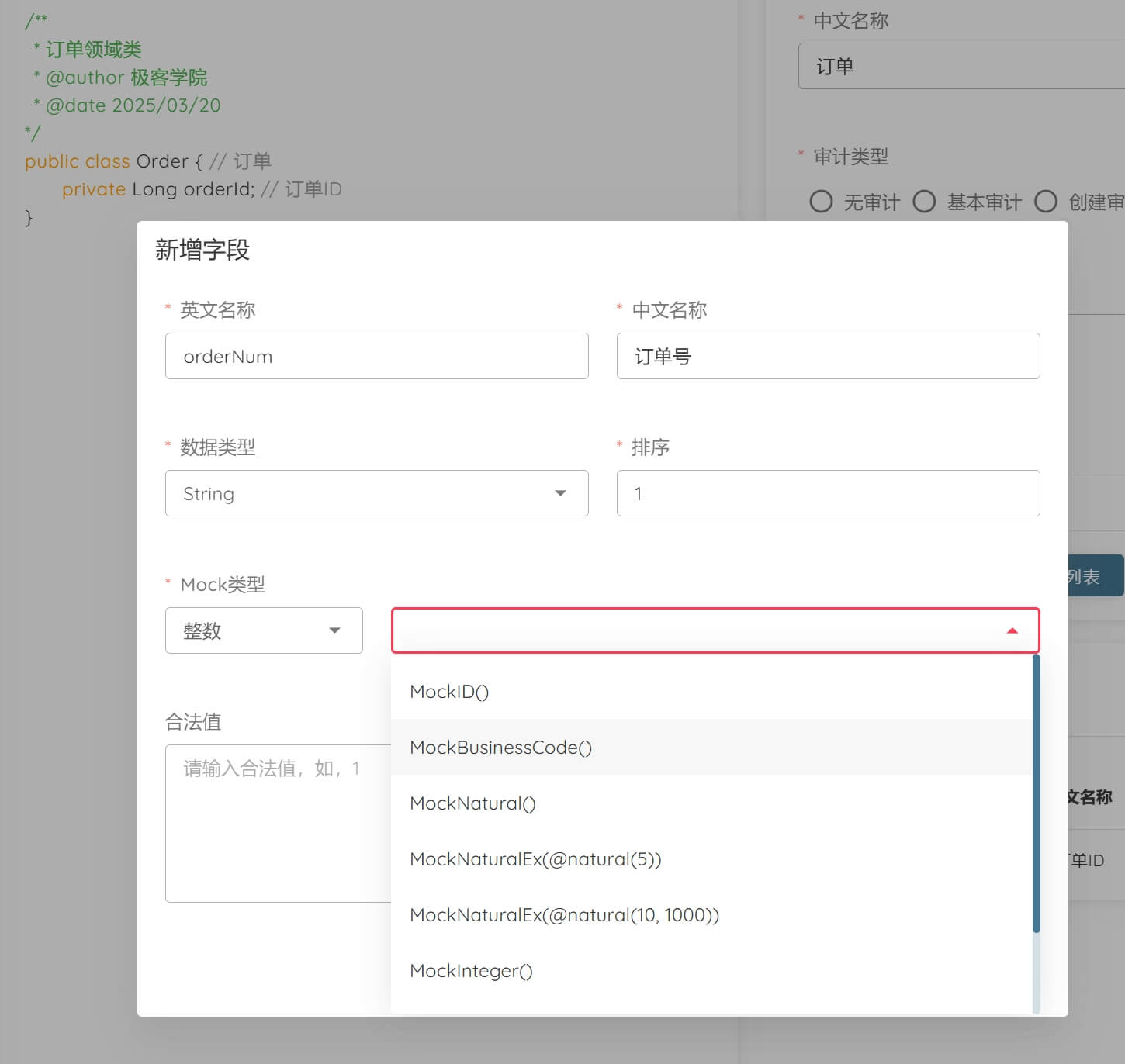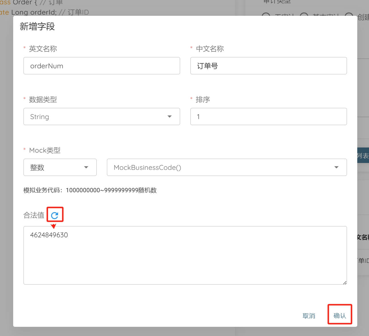 定义字段的英文名称、中文名称、数据类型、字段在领域类中的呈现顺序。选择合适的Mock类型,然后点击合法值右边的刷新图标产生一个字段的Mock值(用于举例该字段的取值和生成测试用例值),如下图所示: