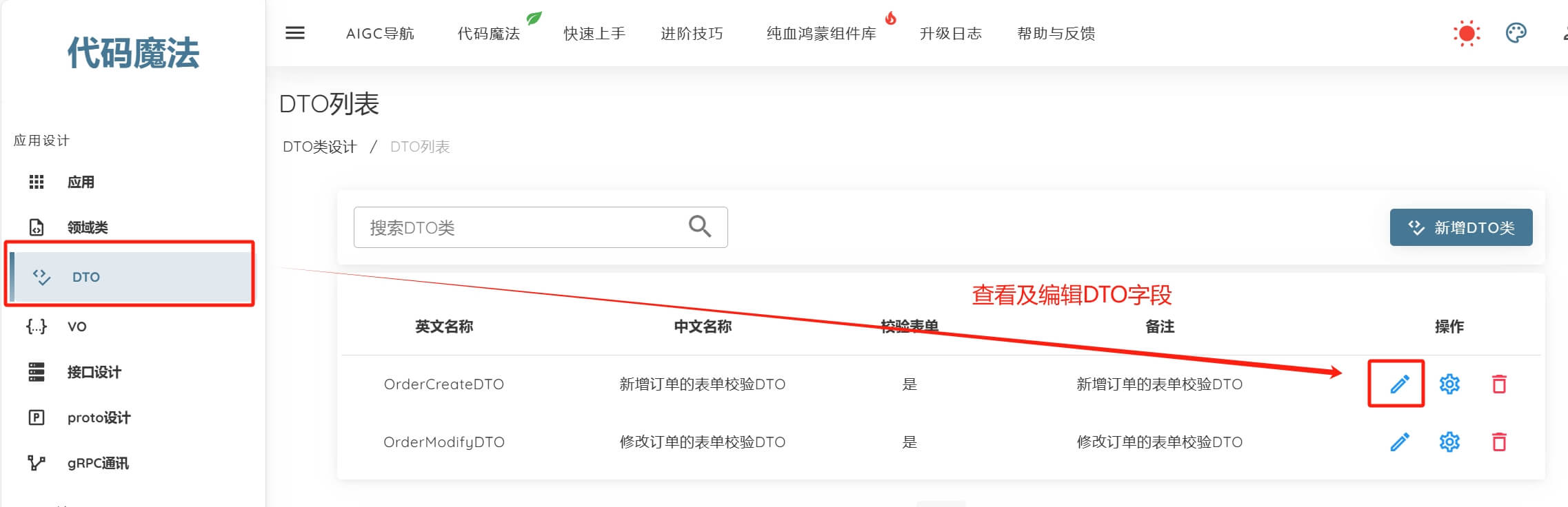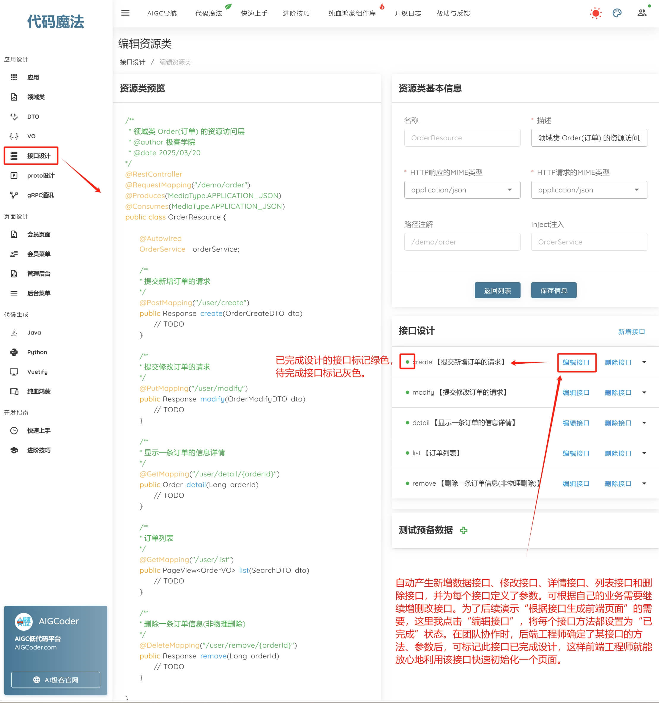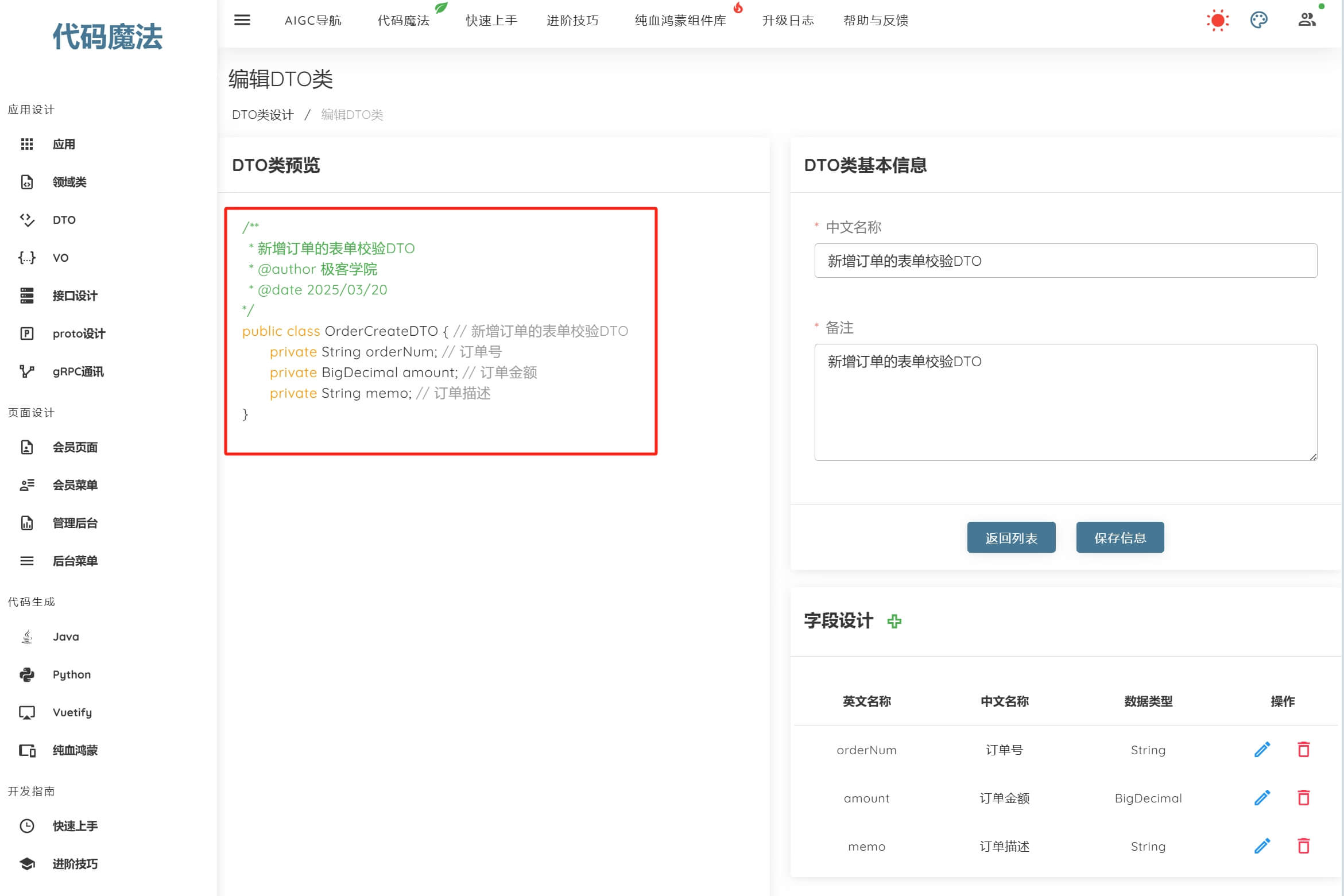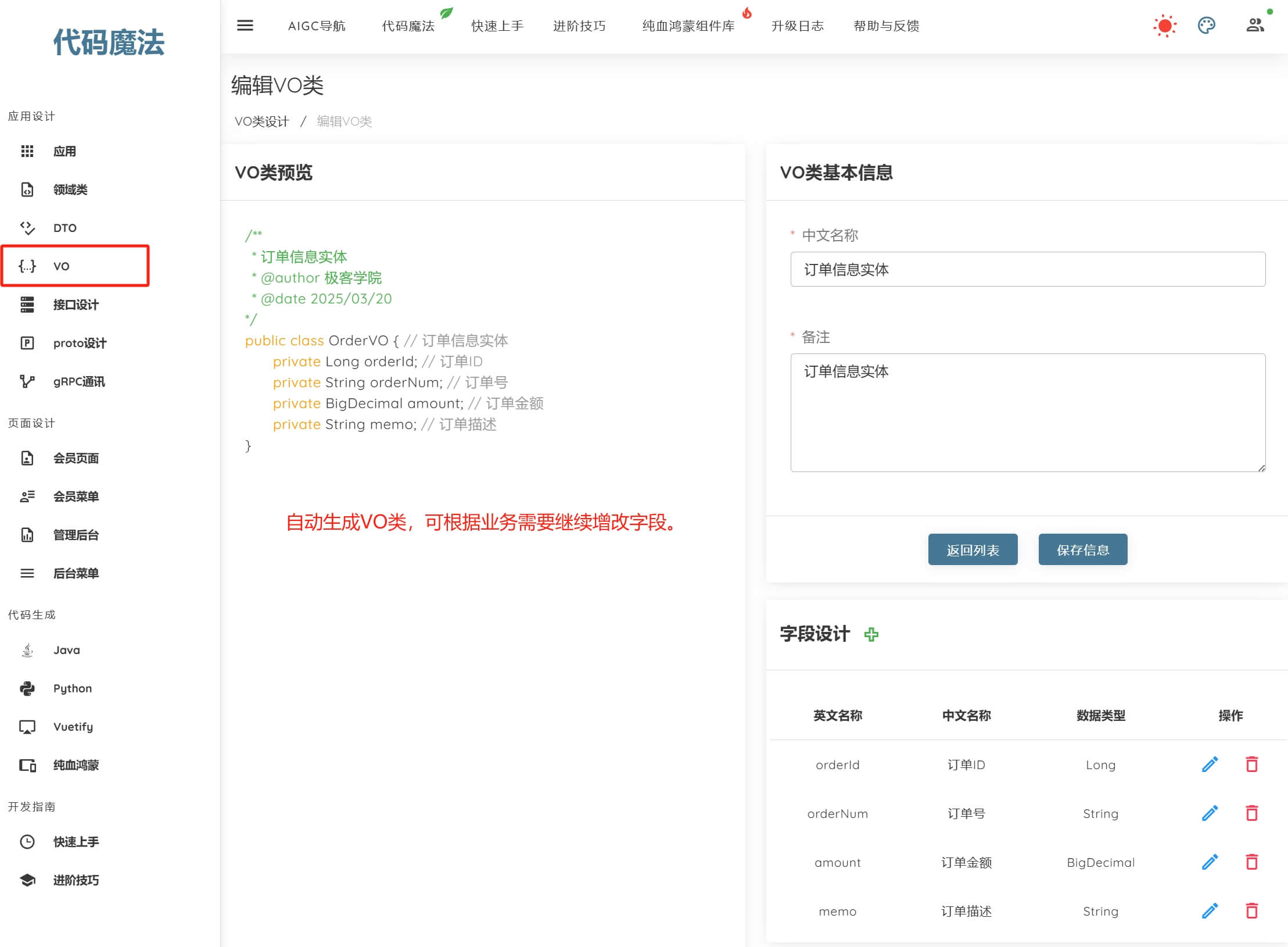 AI极客低代码平台已经自动为我们的领域类设计了新增、修改数据传参用的DTO类和返回查询结果的VO类,以及增删改查的接口方法,如下所示: