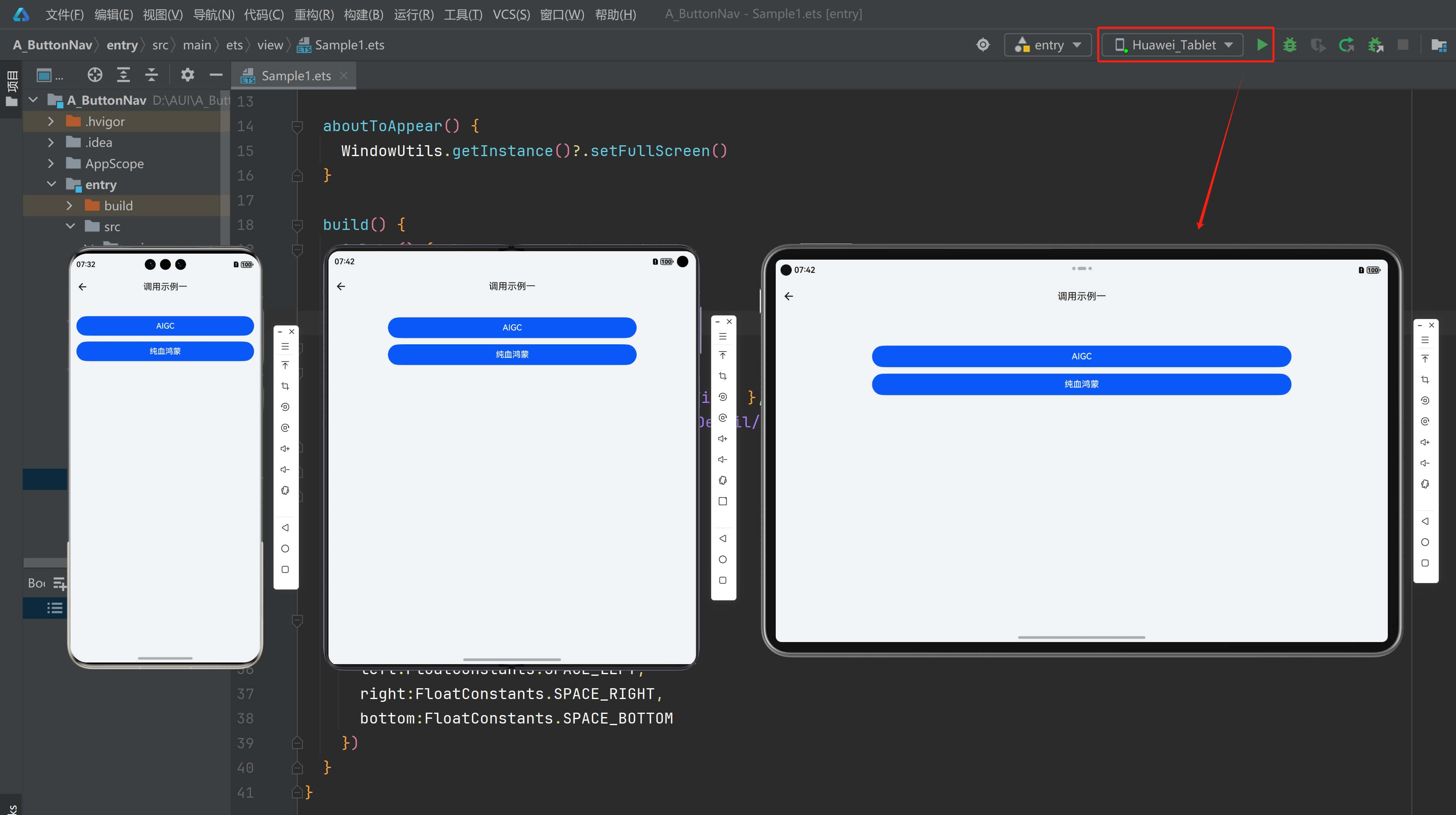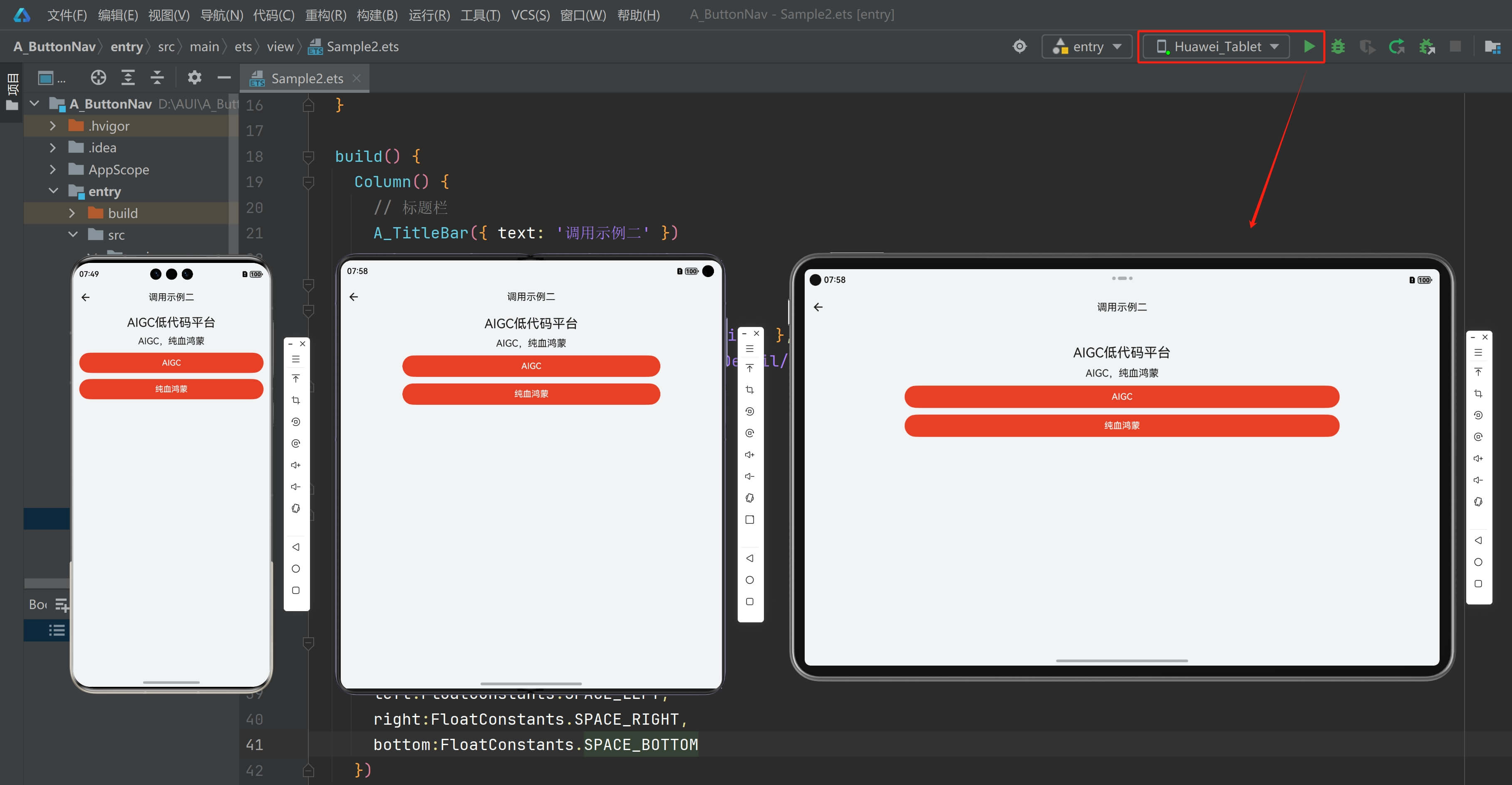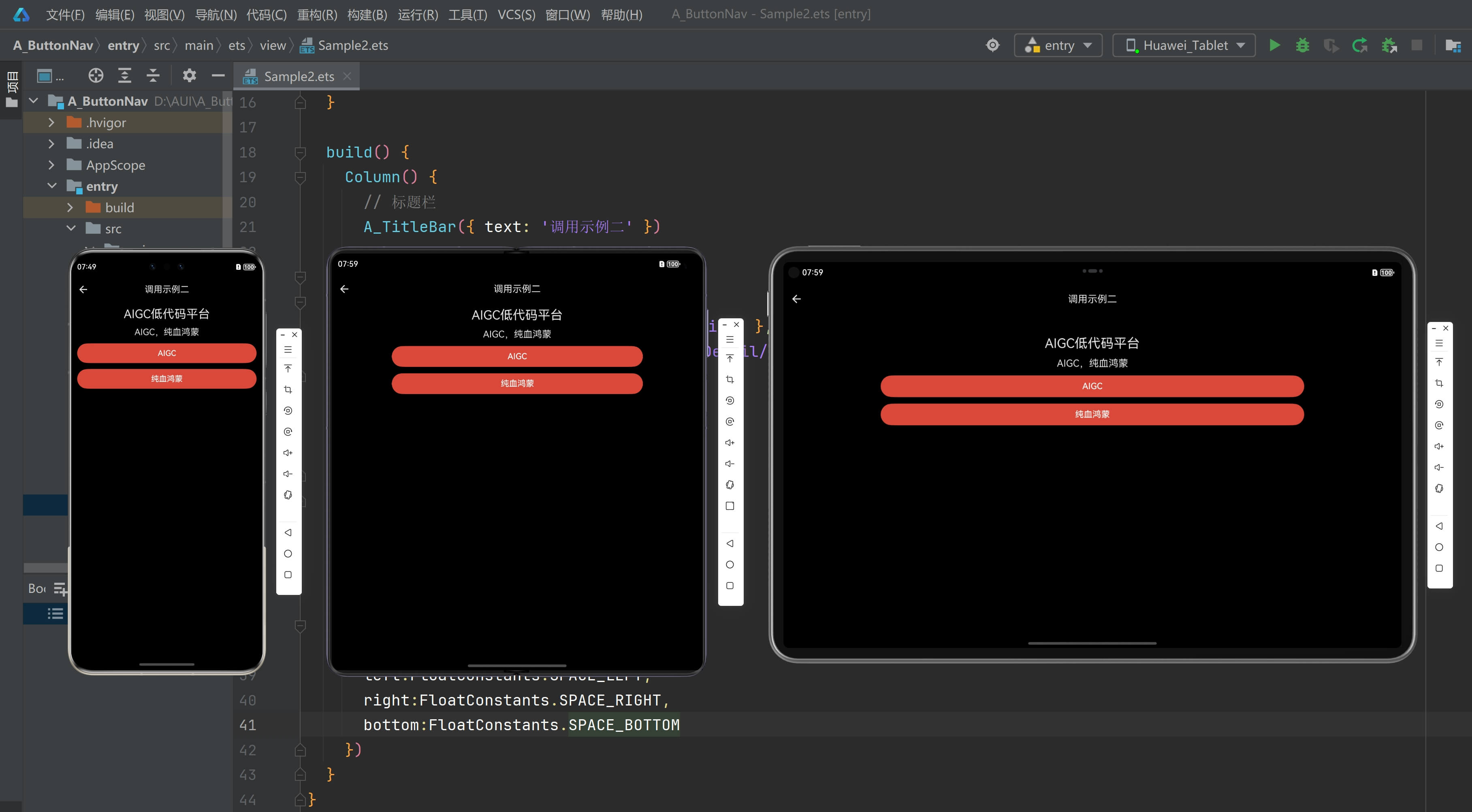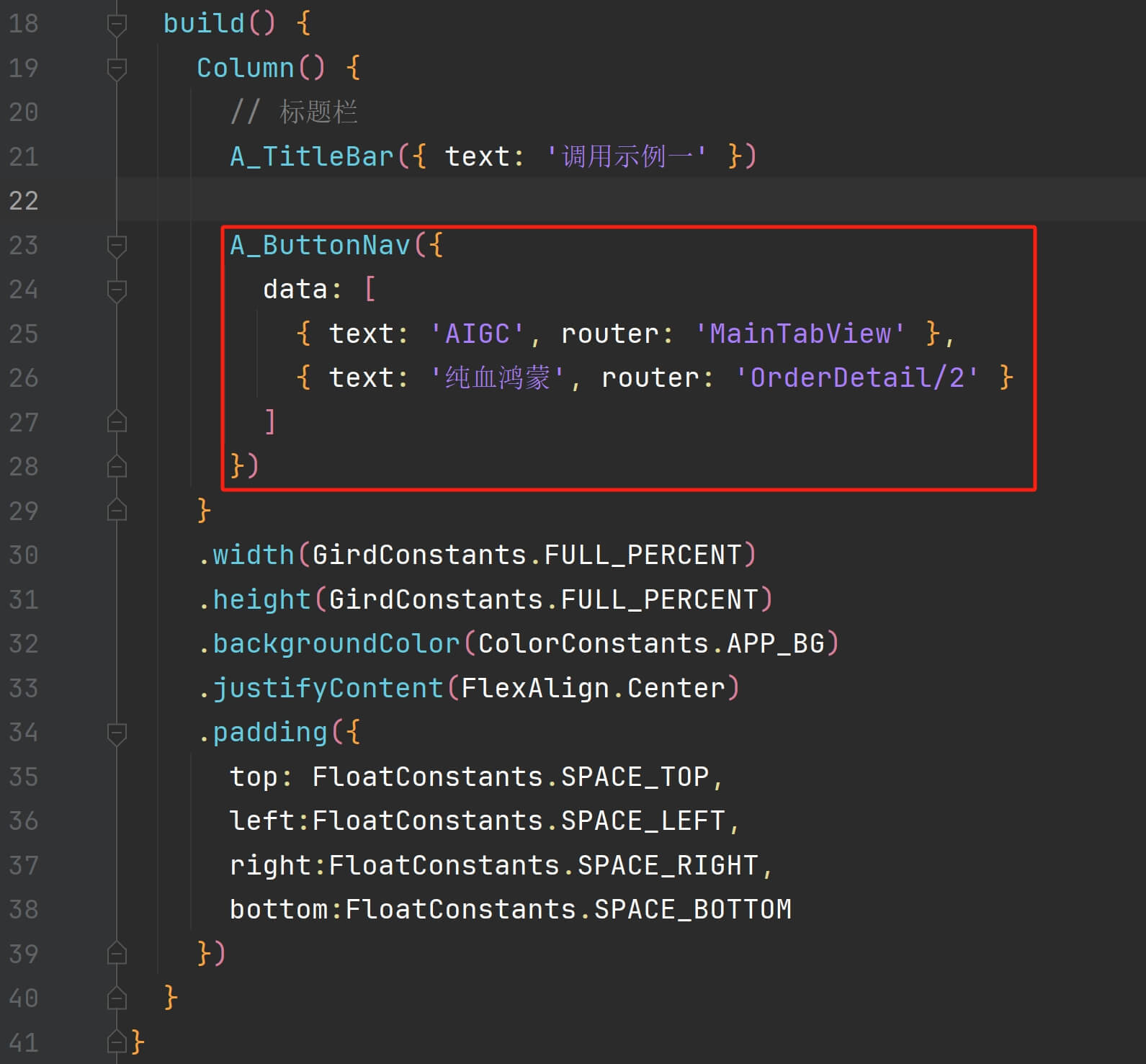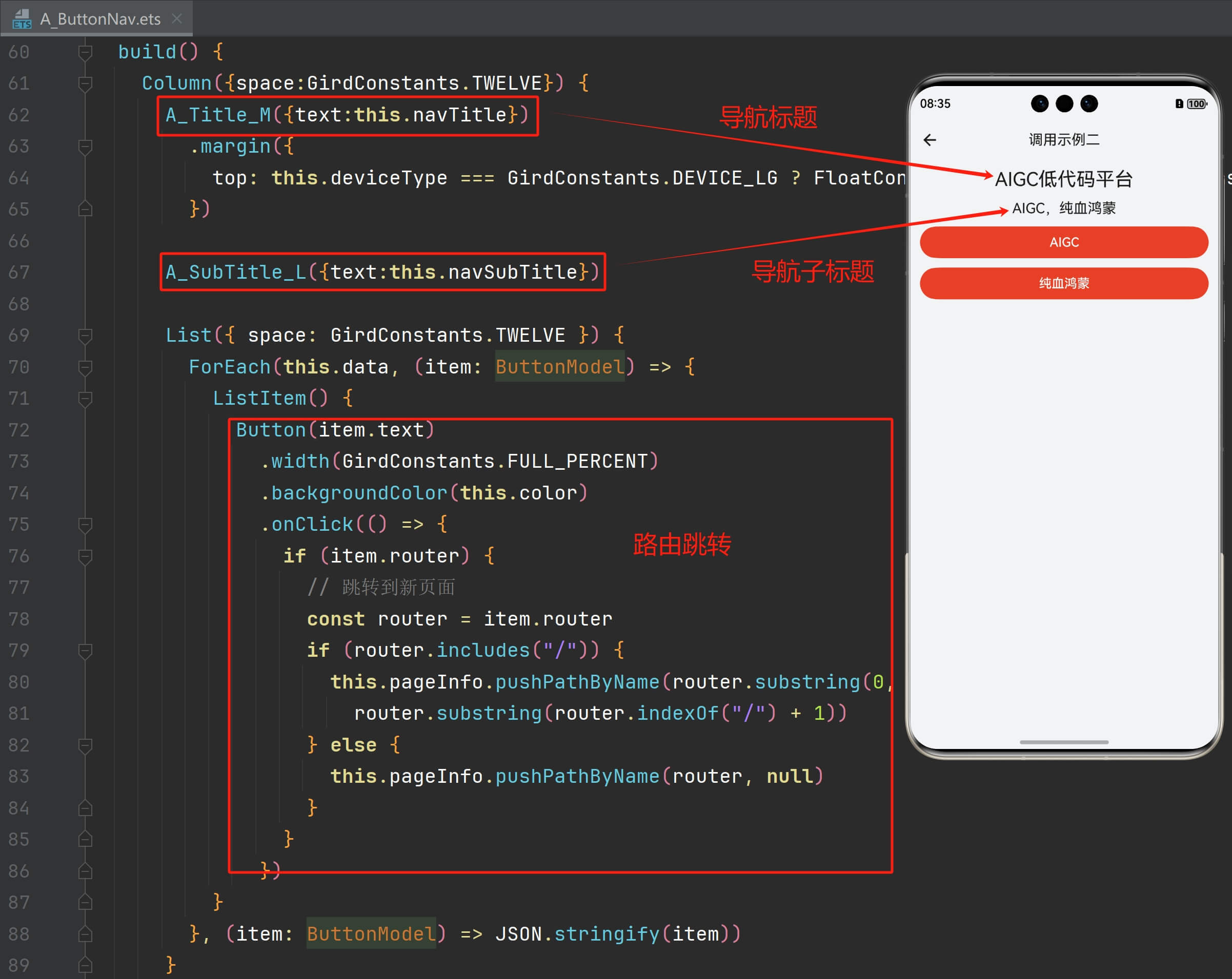 在按钮导航组件的源码中,A_Title_M(中号标题组件)展示导航标题,A_SubTitle_L(大号子标题组件)展示导航子标题,Button组件显示按钮,并通过onClick 点击事件实现路由页面跳转,如下图所示: