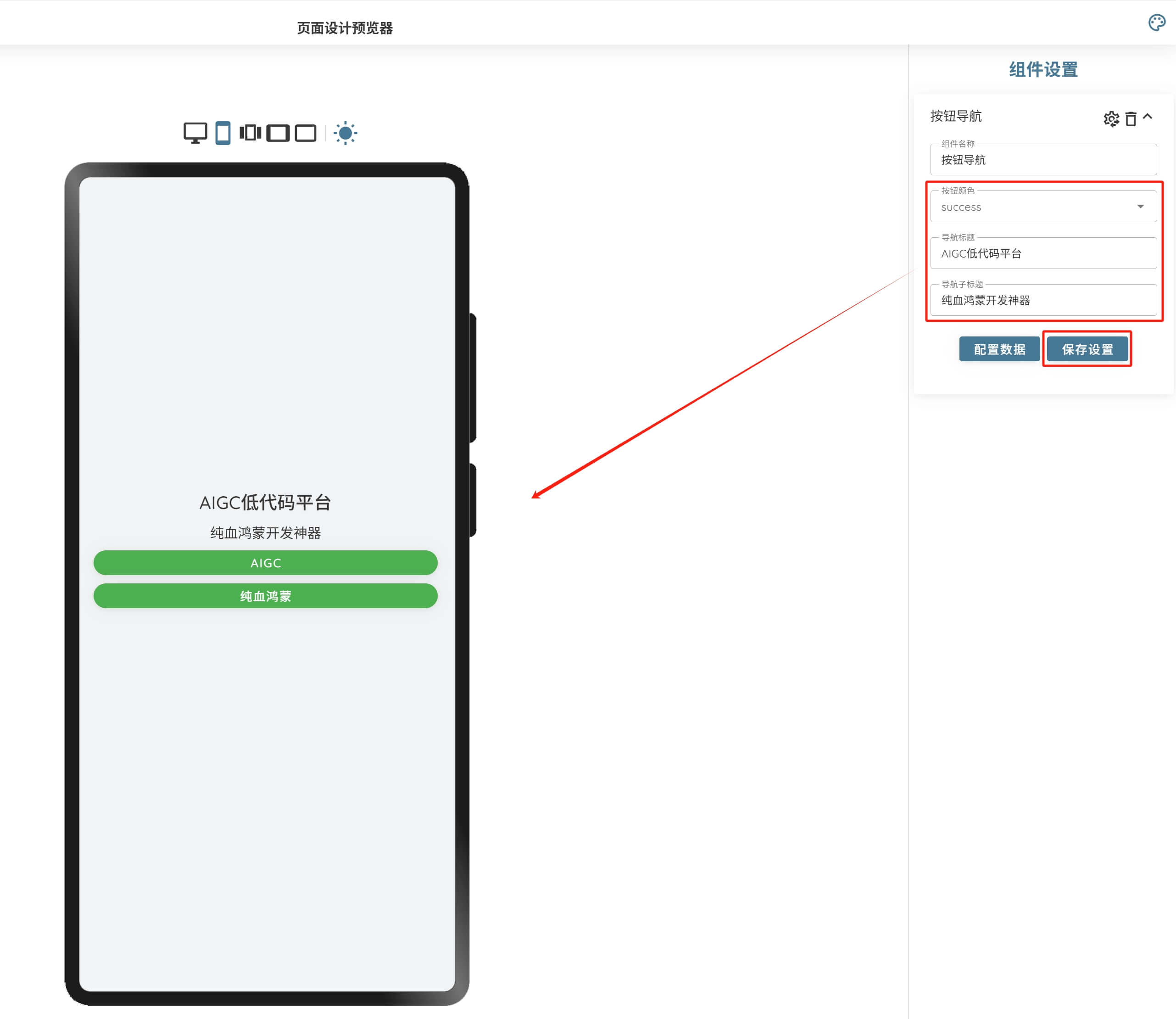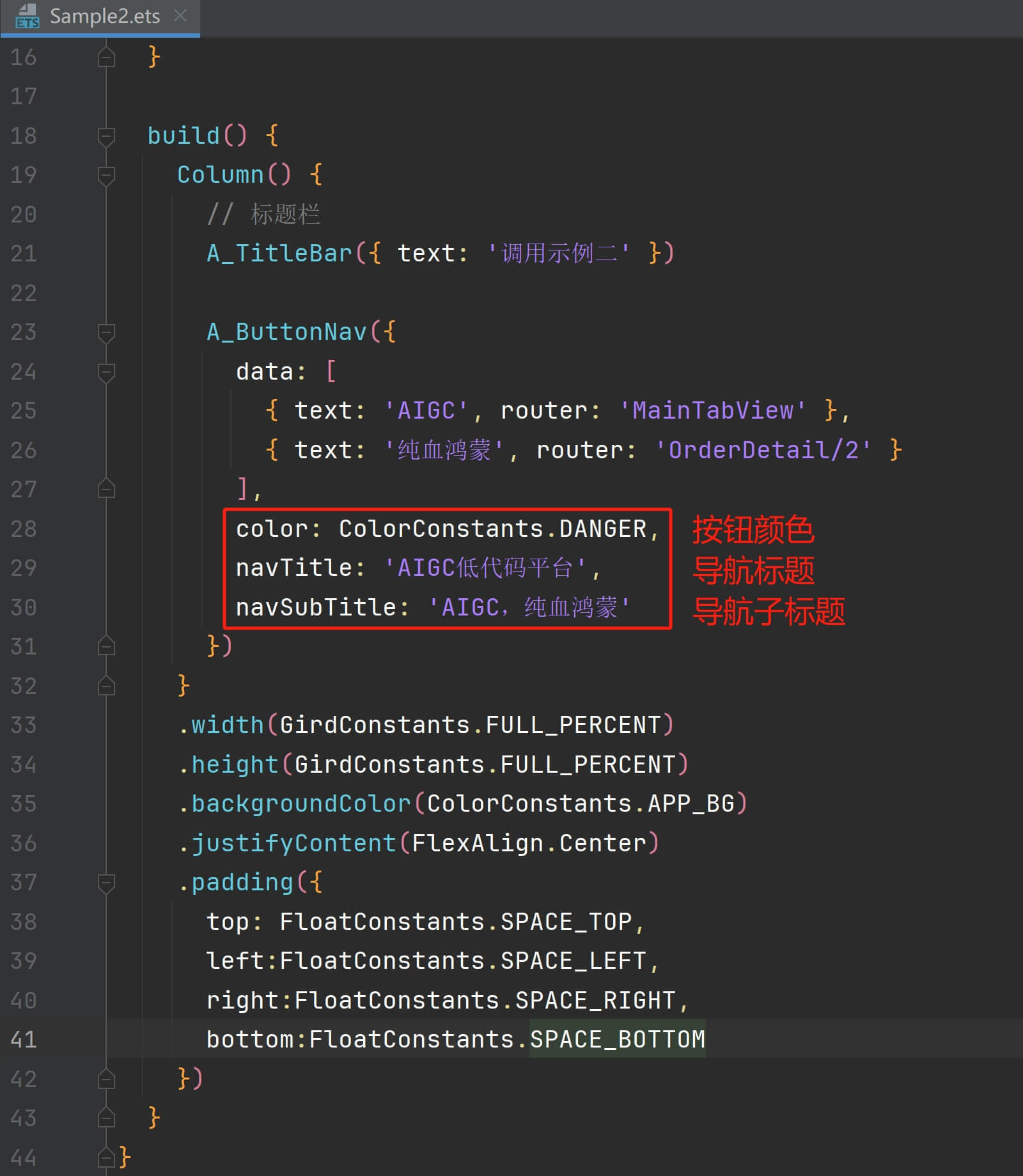 可设置按钮的颜色(color),在颜色常量中有一整套符合鸿蒙官方设计标准的“适配手机、平板、智慧屏、穿戴设备、车机”和“深色模式/浅色模式”的颜色资源定义,还支持按原色分组的 Material Design 调色板。可以根据需要设置导航标题(navTitle)和导航子标题(navSubTitle)。如下图所示: