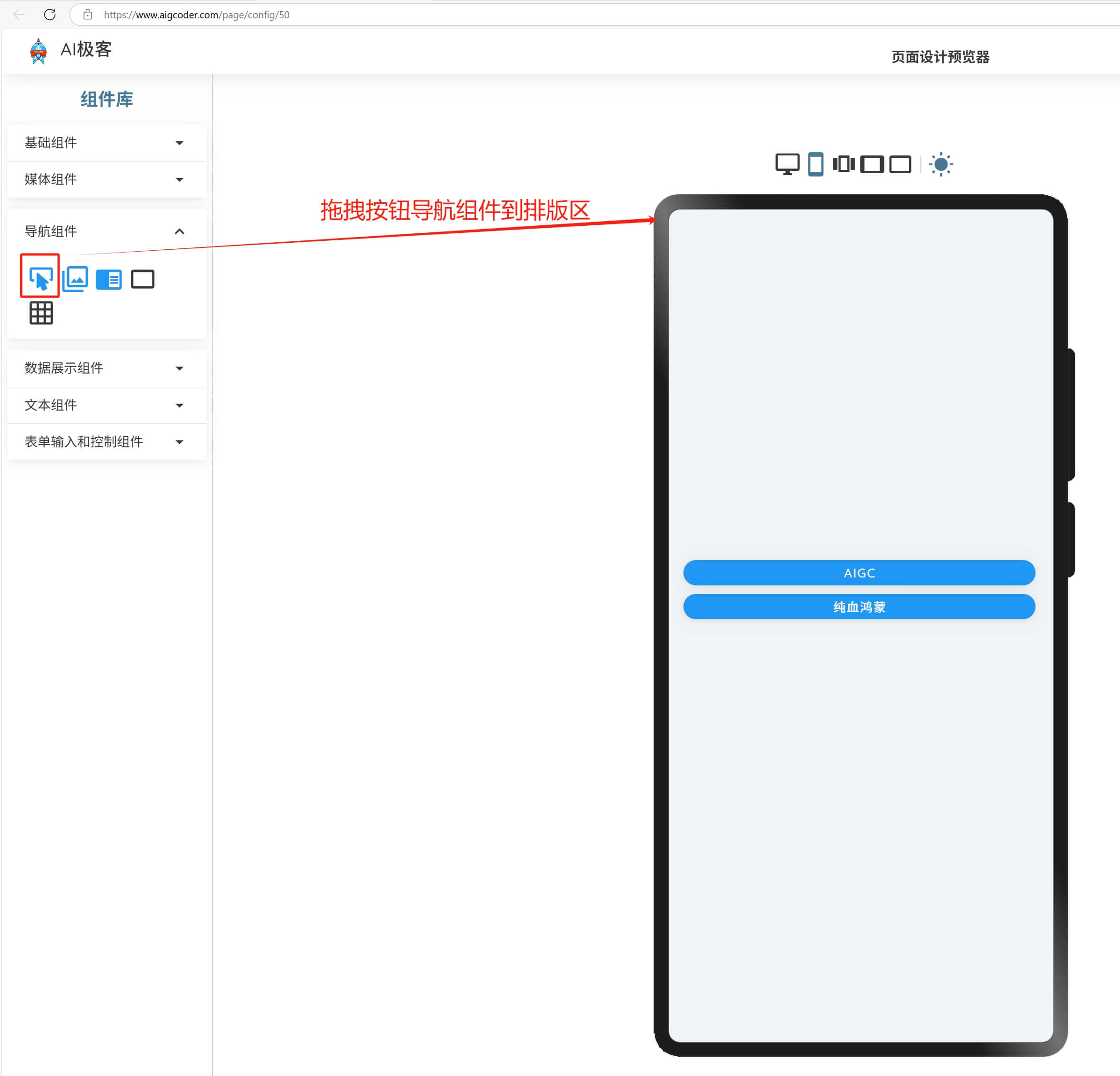 从组件库将“按钮导航组件”拖拽到页面左上角,注意,按钮导航组件是App引导页专用组件,其它类型页面无法使用该组件。如下图所示: