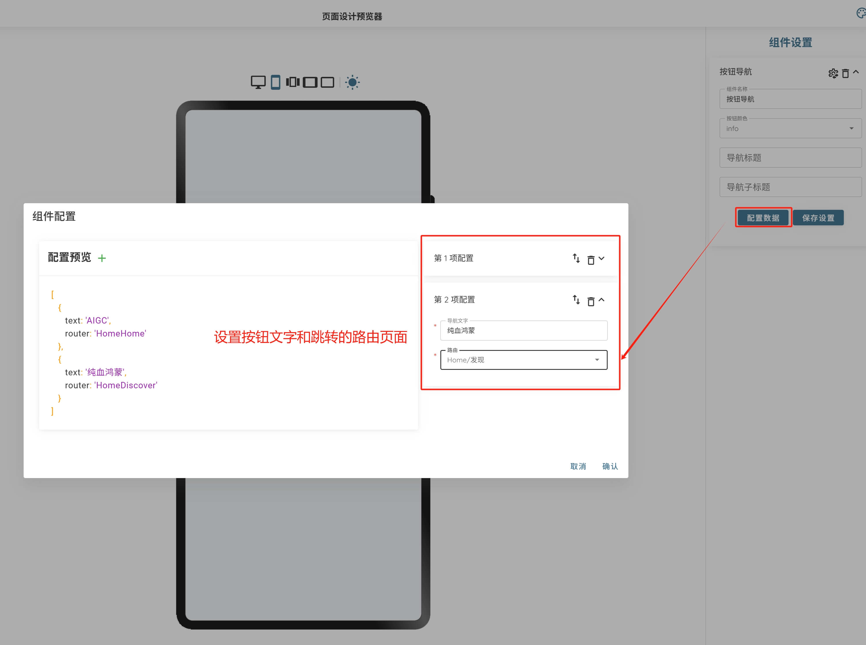 用 A_ButtonNav 调用“按钮导航组件”,只需要给属性 data (导航数据)赋值即可。其中每项数据需要配置按钮的文本和跳转的路由,如下图所示:
