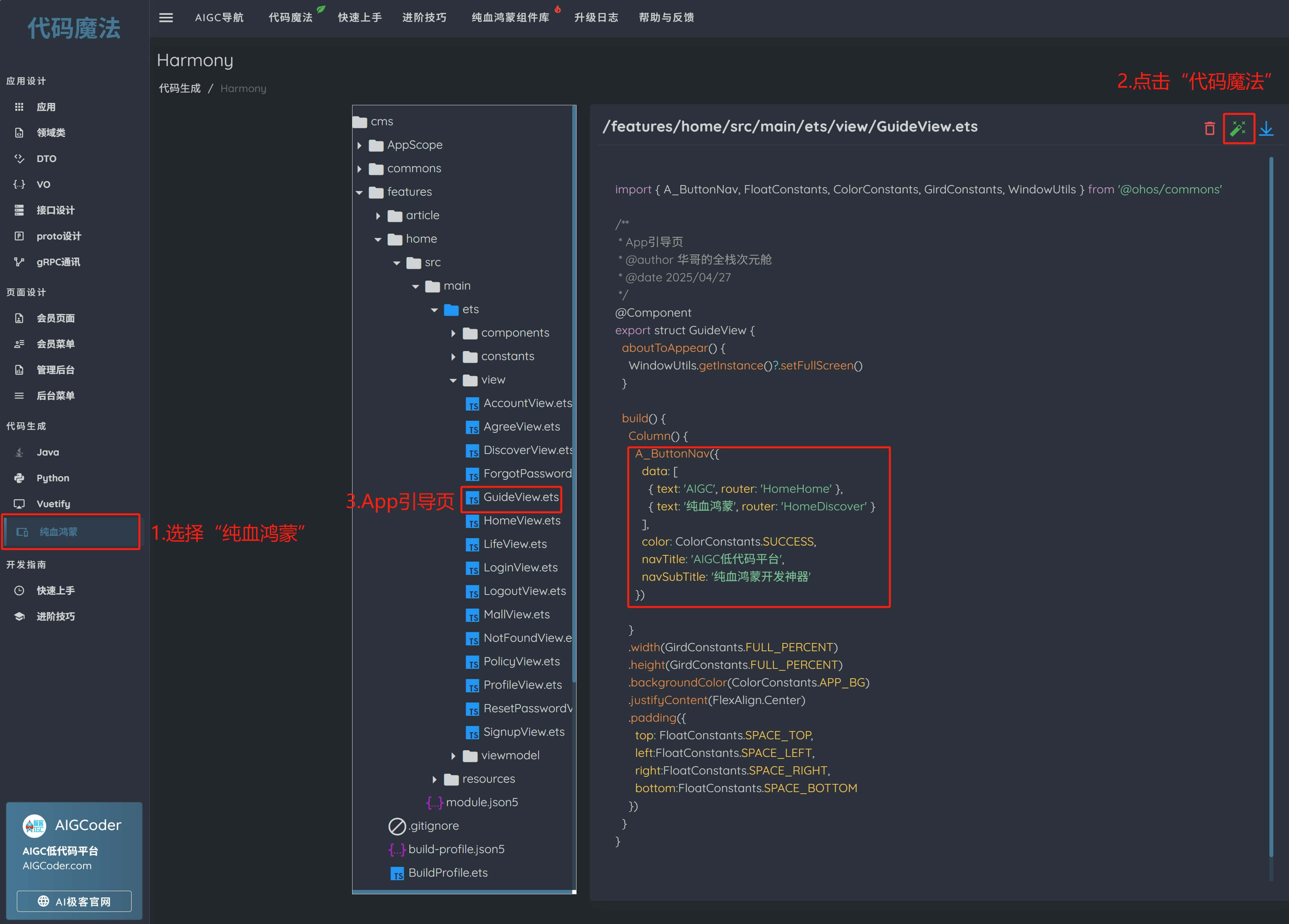 侧栏菜单中,选择“纯血鸿蒙”,然后点击页面右上角的“代码魔法”图标,一秒生成生产级纯血鸿蒙项目工程,然后选择“引导页”(GuideView.ets),查看根据配置生成的鸿蒙代码。如下图所示: