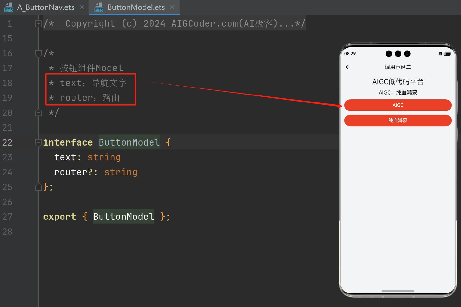 导航数据 data 是一个数组,接受 ButtonModel 的数据结构,用于设置按钮的文本(text)和页面跳转的路由(router):