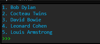name_list = ['david bowie', 'louis armstrong', 'leonard cohen', 'bob dylan', 'cocteau twins']