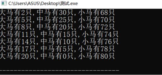 printf("大马有%d只,中马有%d只,小马有%d只\n",a,b,c);