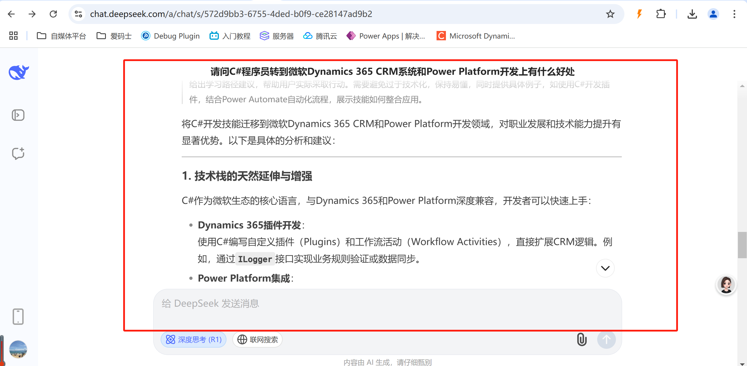 C#程序员转型,将C#开发技能迁移到微软Dynamics 365 CRM和Power Platform开发领域,对职业发展和技术能力提升有显著优势。以下是Deepseek的具体的分析和建议: