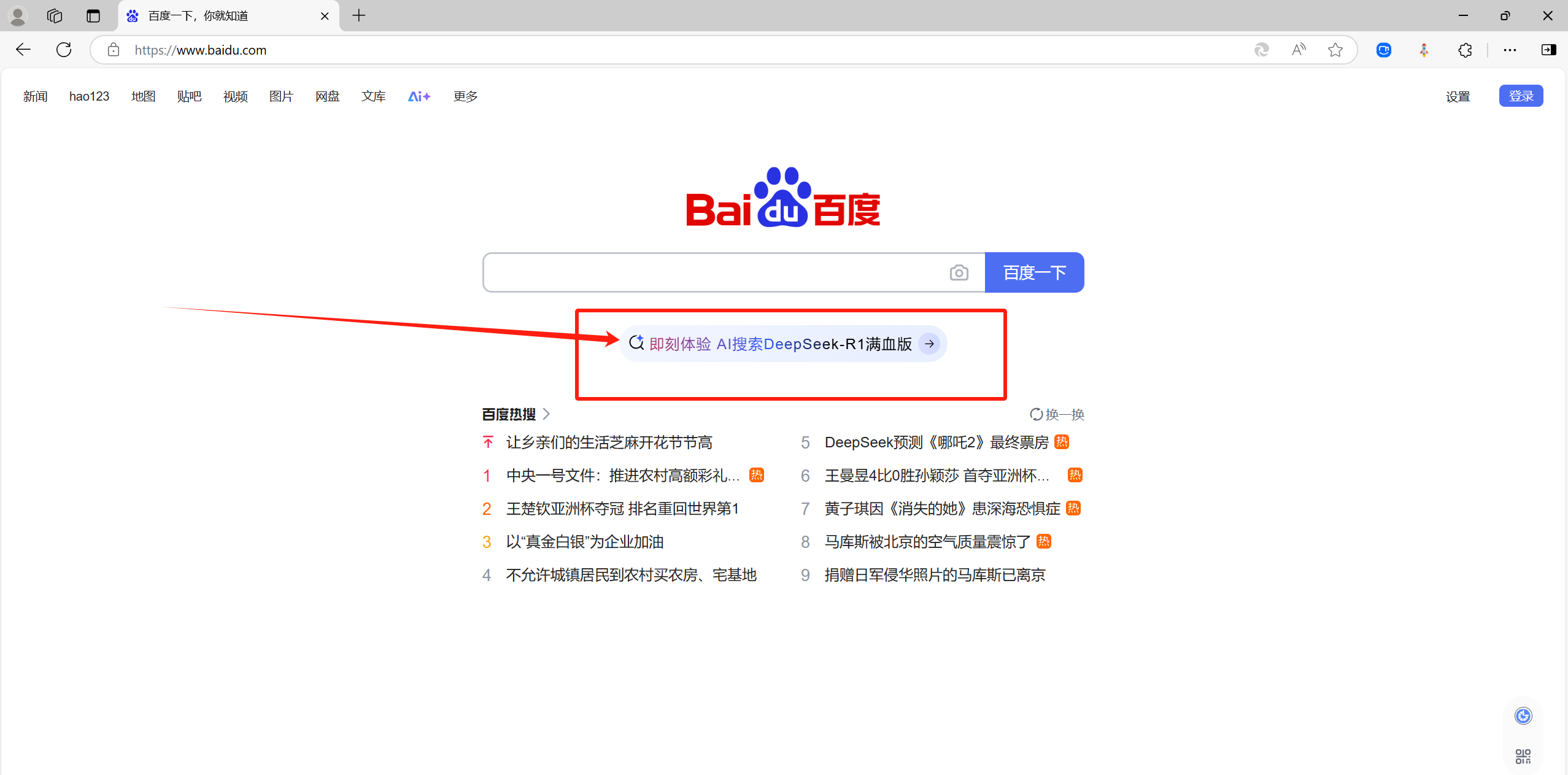 打开百度首页,在搜索框下面有“即刻体验 AI搜索DeepSeek-R1满血版”,也可以参考我发的图片。