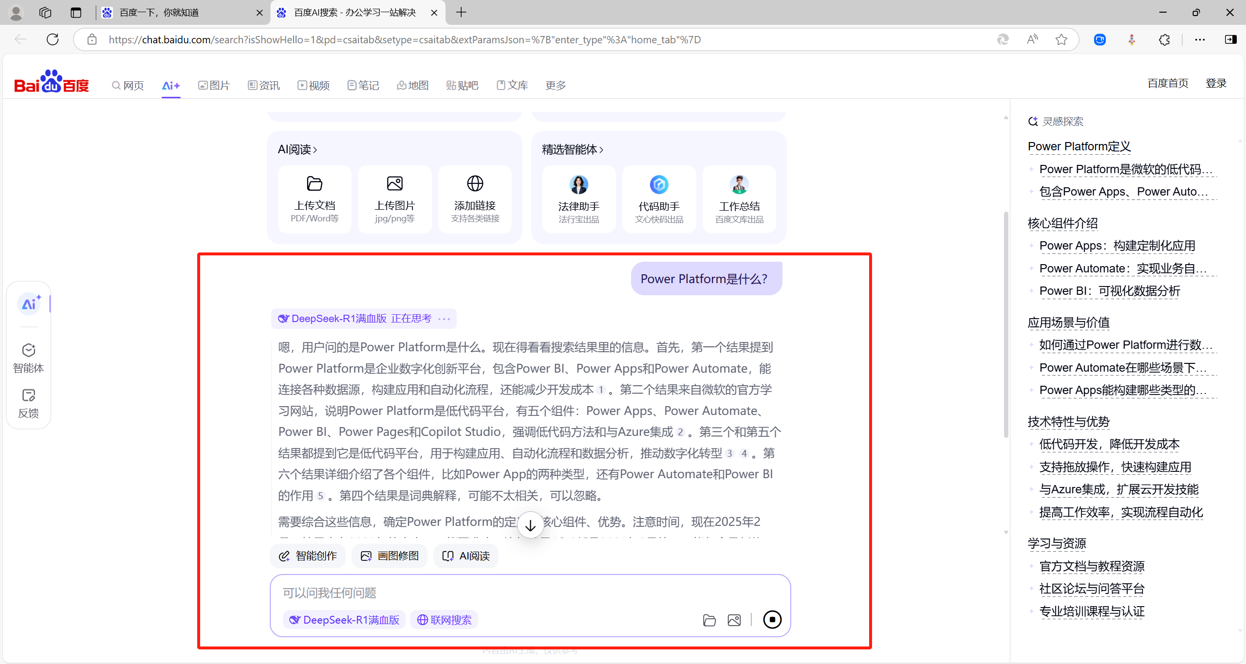 现在百度部署的这个版本非常好用,推荐给大家,百度首页的AI菜单的链接也换成了百度部署的DeepSeek,替代了百度自己研发的AI“文心一言”。
