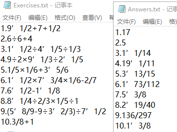 说明我们出题功能里实现的输出是符合需求的,即“真分数在输入输出时采用如下格式,真分数五分之三表示为3/5,真分数二又八分之三表示为2’3/8。”并且具有计算10000道题的能力。