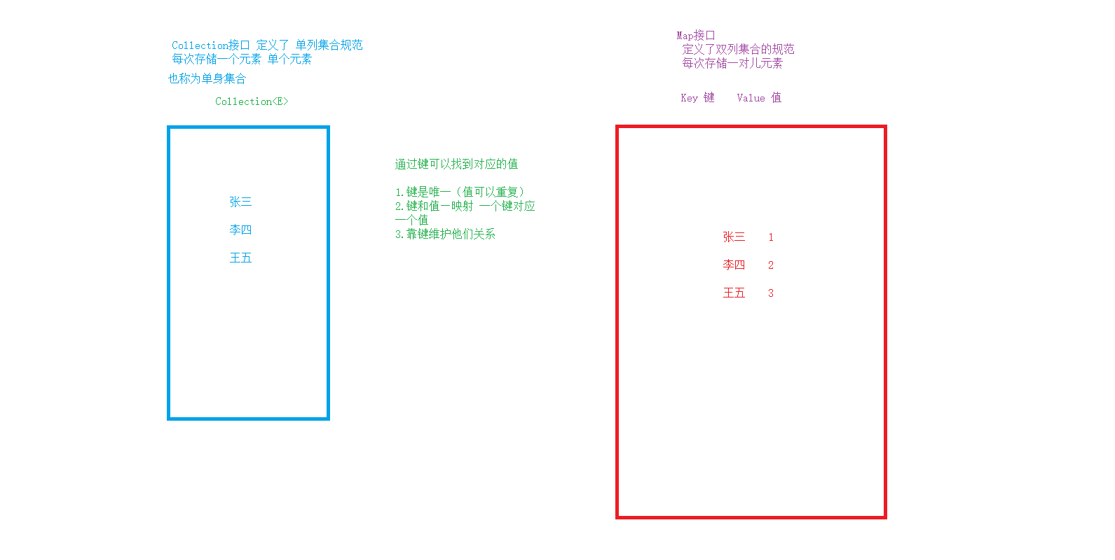 Collection中的集合称为单列集合 Map中的集合称为双列集合