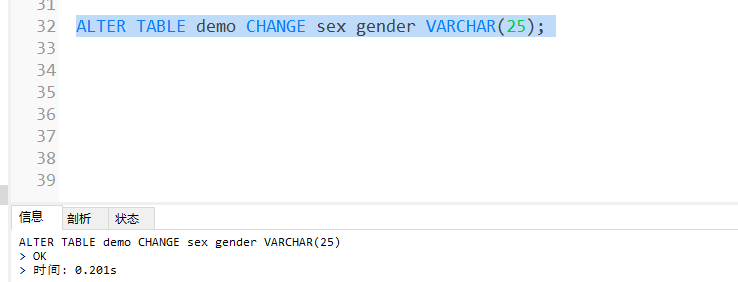 ALTER TABLE 表名 CHANGE 列名 新列名 新数据类型;修改列名称 类型