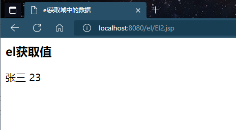 <%@ page contentType="text/html;charset=UTF-8" language="java" %> <html> <head> <title>el获取域中的数据</title> </head> <body> <% //在域中存储数据 request.setAttribute("name","张三"); session.setAttribute("age","23"); %> <h3>el获取值</h3> ${requestScope.name} ${sessionScope.age} ${sessionScope.haha} </body> </html>