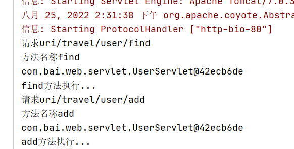package com.bai.web.servlet; import javax.servlet.ServletException; import javax.servlet.annotation.WebServlet; import javax.servlet.http.HttpServlet; import javax.servlet.http.HttpServletRequest; import javax.servlet.http.HttpServletResponse; import java.io.IOException; @WebServlet("/user/*") public class UserServlet extends BaseServlet { protected void add(HttpServletRequest req, HttpServletResponse resp) throws ServletException, IOException { System.out.println("add方法执行..."); } protected void find(HttpServletRequest req, HttpServletResponse resp) throws ServletException, IOException { System.out.println("find方法执行..."); } }