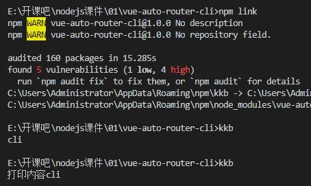 上面代码指定,kkb命令对应的可执行文件为 bin 子目录下的 kkb.js。Npm会寻找这个文件,在node_modules/.bin/目录下建立符号链接(软链接)。在上面的例子中,kkb.js会建立符号链接node_modules/.bin/kkb。由于node_modules/.bin/目录会在运行时加入系统的PATH变量,因此在运行npm时,就可以不带路径,直接通过命令来调用这些脚本。