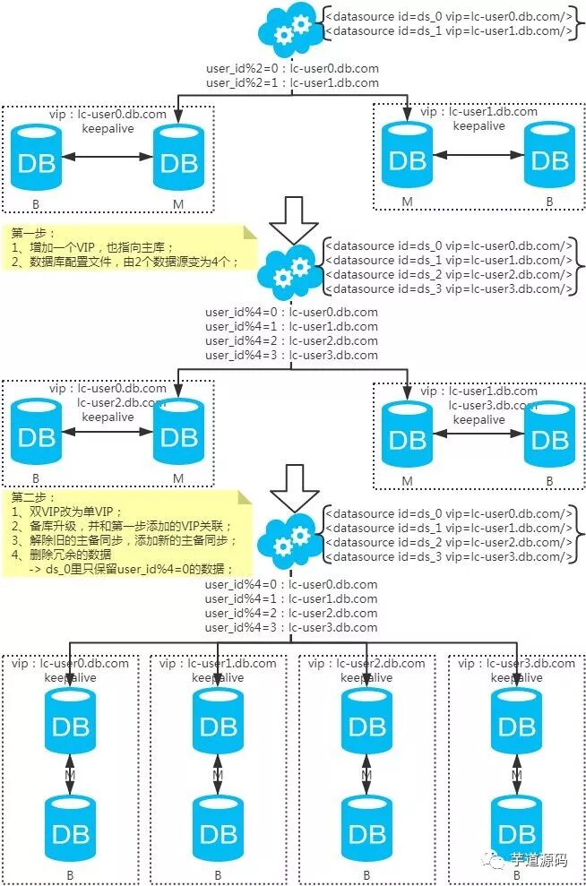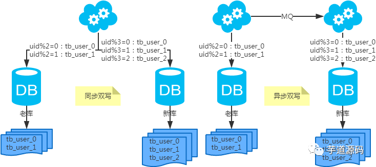 第一步:(同步双写)应用配置双写,部署;第二步:(同步双写)将老库中的老数据复制到新库中;第三步:(同步双写)以老库为准校对新库中的老数据;第四步:(同步双写)应用去掉双写,部署;