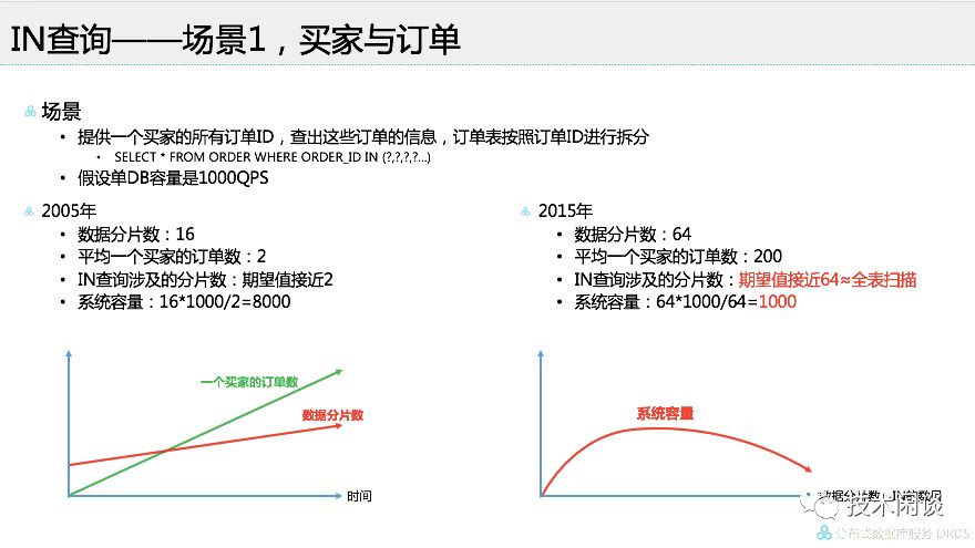 但是如果后期业务规模增长,平均一个买家订单数量扩了100倍(IN后面列表长度200),实例扩容了4倍。此时整个DRDS的逻辑QPS能力是1000。相比之前的业务能力,这个是下降了。