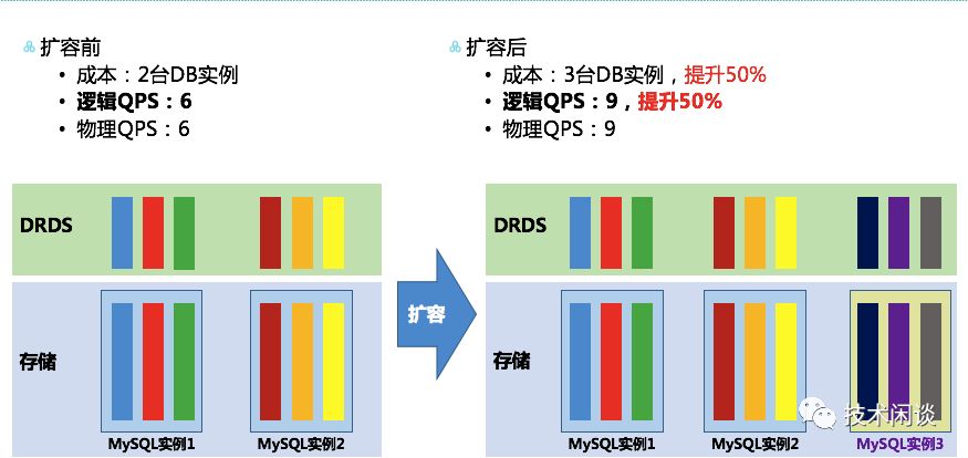 此时如果后端数据层扩容增加了1个MySQL实例,则物理QPS提升50%,逻辑QPS也提升50%。当然这里前提是Server节点层不是瓶颈(Server节点的QPS能力高于MySQL的QPS能力。这类SQL的线性扩展能力就很好。