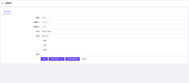 3、创建资产:打开资产管理,找到demo,打开查看资产,点击添加资产,填写资产名称及编号。