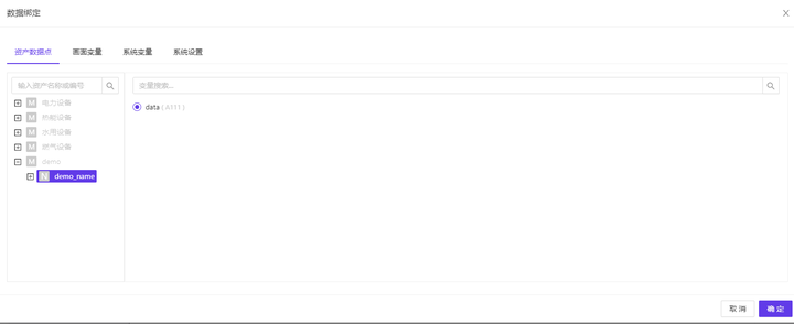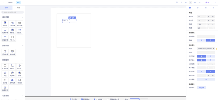 4、创建画面:打开画面管理,创建画面,添加组件组,添加数据点组件,点击属性“数据”,展开数据点树,绑定数据点。点击右上角“