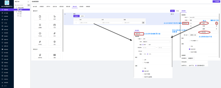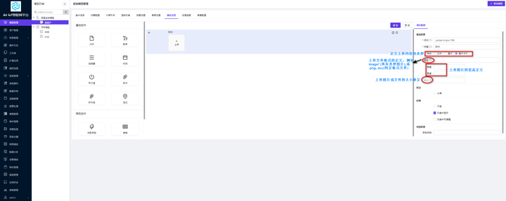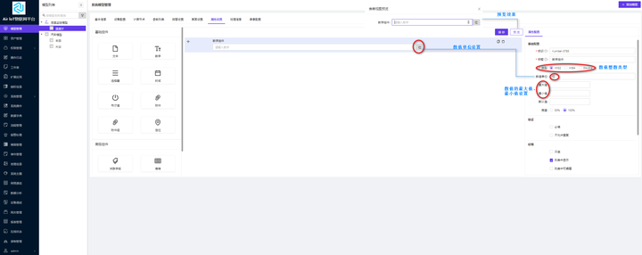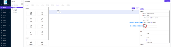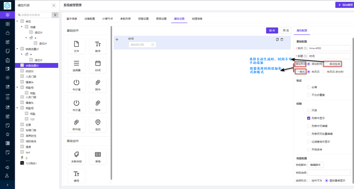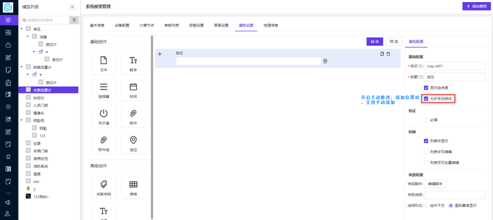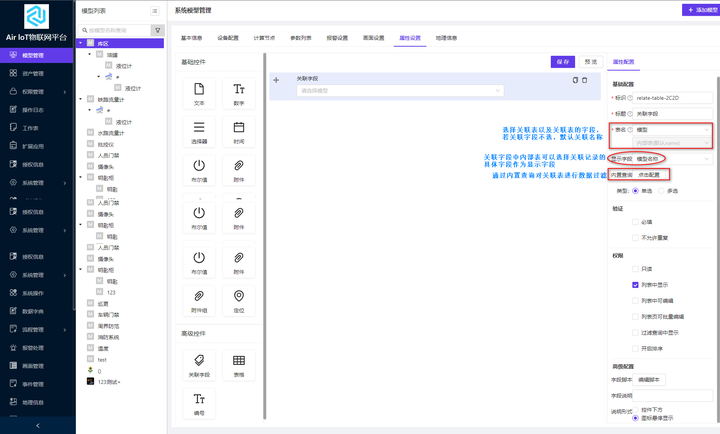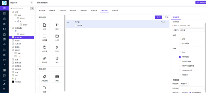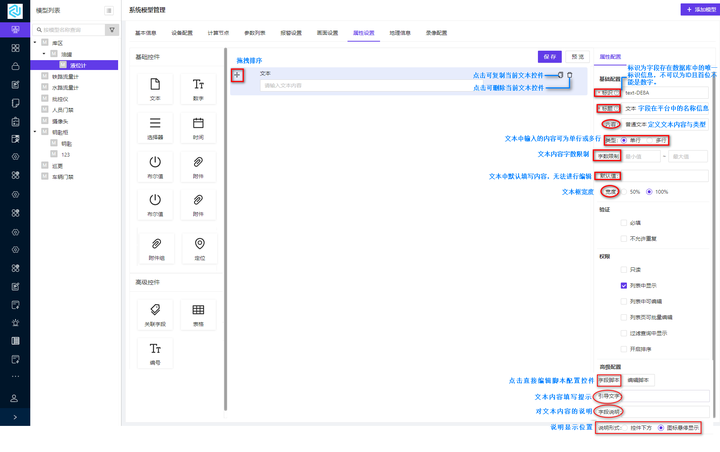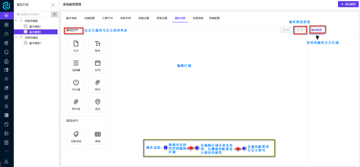 模型属性支持用户自定义资产的属性。点击【属性设置】跳转到属性配置的页面;属性配置页面包括基础控件和高级控件,其中基础控件包括文本控件、数字控件、选择器控件、时间控件、布尔值控件、附件控件、附件组控件和定位控件,高级控件包括关联字段控件、表格控件和编号控件。属性配置页面的说明显示如图 1-25 所示: