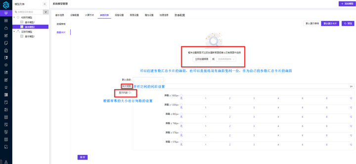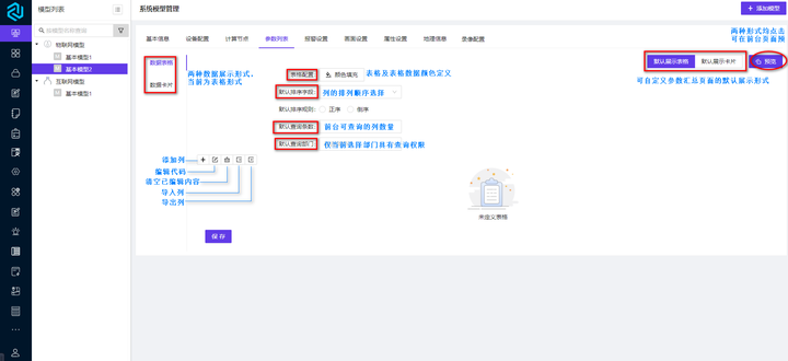 点击【参数列表】跳转至参数列表定义的页面,参数列表包括表格形式及卡片形式,两种形式可同时定义,默认优先展示表格形式,用户可以按照自己的需求设定默认展示形式。每种形式的参数汇总定义完成后,可以点击【预览】查看前台效果。