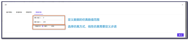当勾选仿真服务后,会出现数据仿真的配置,主要用于定义仿真数据的规则,仿真方式包括线性及随机,数据仿真的配置说明显示如图 1-11 所示: