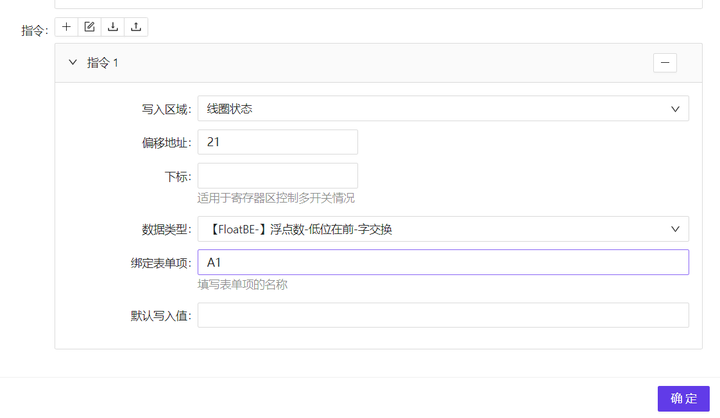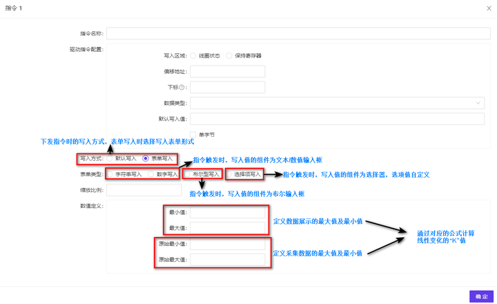 指令用于设备远程控制;点击添加图标,在弹出的弹窗中可以进行指令得添加;需要执行负载动作,如进行输入、选择时,需要选择表单写入,指令的配置说明显示如图 1-12 所示: