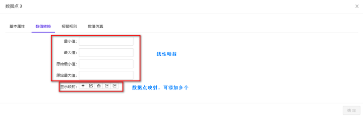 数值转换支持线性映射和数据点映射,最大值、最小值、原始最大值和原始最小值用于设置线型映射。显示映射可添加多个数据点映射,通过设置值与显示值实现数据点的映射。数据转换的配置说明显示如图 1-9 所示: