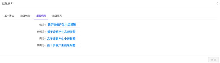 定义采集到的数据点的简单报警规则,包括低低、低、高、高高的报警数值定义,报警规则的配置说明显示如图 1-10 所示: