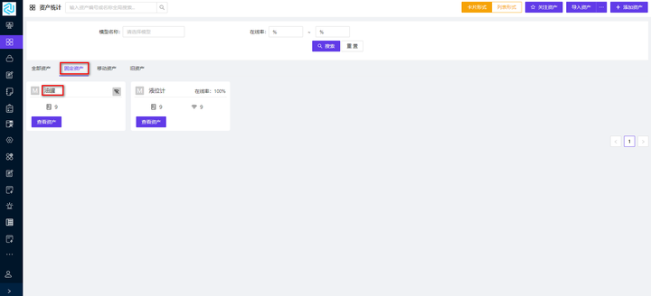 1) 资产类型:用户需在【系统配置】的【资产配置】中自定义资产类型。资产类型用来分类管理资产,选择分类后,该模型的资产显示到选择的 tab 中;资产类型的选择与在资产管理页面的显示分别如图 1-4、1-5所示:
