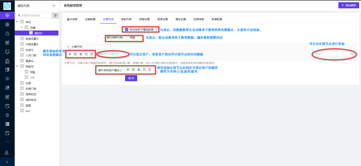 模型的添加信息包括基础信息、设备配置(包括资产驱动信息、数据点信息、指令信息)、计算节点、参数列表、报警配置、画面设置、属性设置(自定义属性)、地理信息和录像配置;