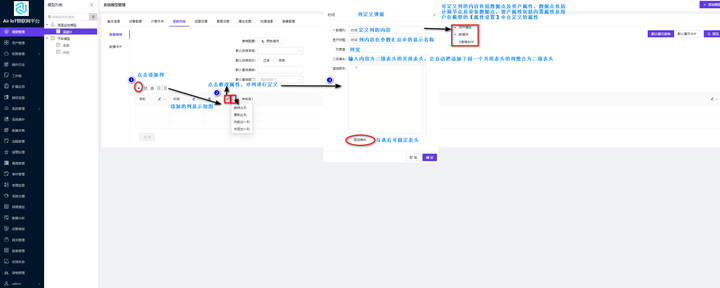 列编辑的操作流程:点击【添加列】的图标——>鼠标悬停在已创建列的向下的箭头,选择【修改属性】——>在属性编辑中【选择列】进行定义;