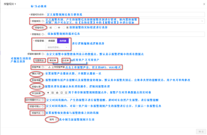 报警规则名称、类别、级别、描述、逻辑为必填项;
