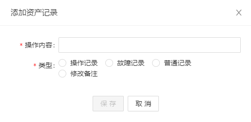 资产变更记录用于用户主动添加资产的变更信息,变更记录的类型包括操作记录(对资产进行了哪些操作)、故障记录(资产出现的故障信息记录)、修改备注(资产备注的修改)、普通记录(即其他记录)详见图 2-6;
