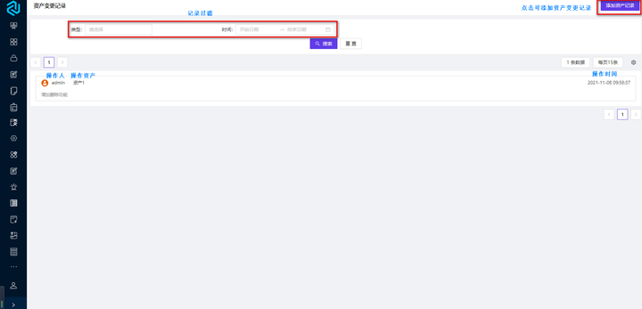 资产列表页的资产变更记录是模型下所有资产变更记录的管理页面,某个资产的变更记录的查看在资产列表的“操作”的【记录】中,点击跳转至当前资产的资产变更记录页面,用户可以添加当前资产的变更记录;