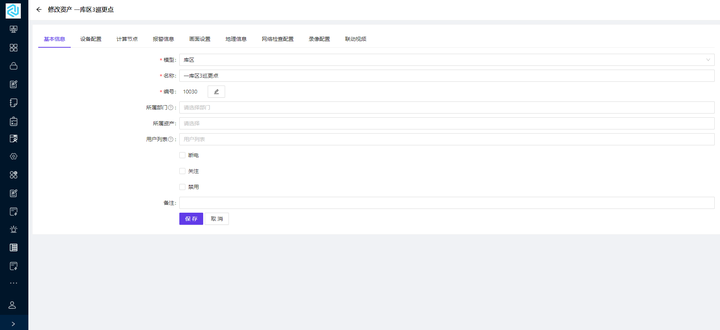 资产编辑的入口包括两个,一个是添加资产时直接点击【保存】进行编辑,一个是资产列表操作栏的编辑 icon;资产编辑的配置项同模型,默认继承模型的配置,在页面不做展示,若资产特殊,可以在资产上单独进行配置;