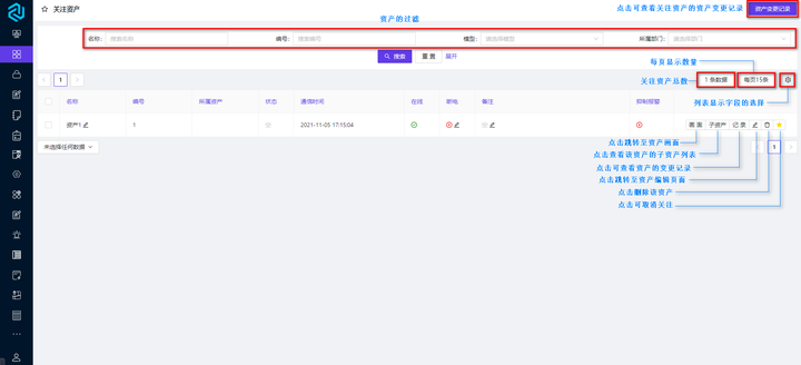 关注资产为用户添加资产时勾选的关注属性,关注资产统一进行管理。资产管理页面的关注资产可查看平台中的全部关注资产。对关注资产可以进行编辑、删除、查看资产画面、查看子资产、查看资产变更记录、取消关注的操作;关注资产列表页的说明显示如图 2-3所示;