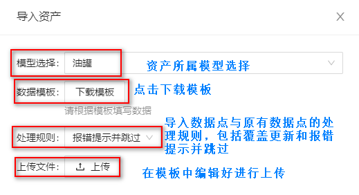 导入资产需要先选择模型,平台会根据模型的驱动配置生成对应数据点的上传模板,资产的所有信息均支持导入。当资产编号重复时有两种处理规则,报错提示并跳过或覆盖更新,详见图 2-5
