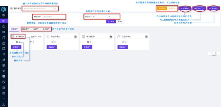 点击模型卡片的【查看资产】跳转至模型的资产列表页面,资产列表页的说明显示如图2-5 所示;资产列表页的导入资产、导入数据点、添加资产不需要进行模型的选择,其他操作通资产管理页面。