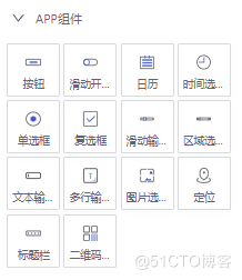 APP组件包括按钮、滑动开关、日历、时间选择器、单选框、复选框、滑动输入条、区域选择、文本输入、多行输入、图片选择器、定位、标题栏和二维码扫描。