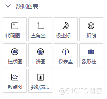 数据图表包括代码图表、直角坐标系容器、极坐标容器、折现、柱状图、饼图、仪表盘、象形柱图、散点图和数据表格,详见下图: